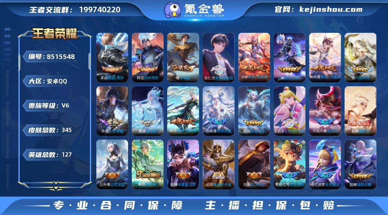 实名: 可修改 性别: 女号 贵族等级: V6 英雄数: 127 皮肤数: 345 荣耀水晶: 鸣剑·曳影,弑枪猎影 传说皮: 黄金射手座,猫影幻舞,炽阳神光,一念神魔,地狱火,仲夏夜之梦,李逍遥,时之恋人-刘备,游龙清影,淬星耀世,记忆之芯,妄想实况,鲁班七号-时之奇旅,永恒水手月亮,夜礼服假面,霜月吟,澜逐花归海,乘龙·问璇玑,乘龙·铭钟鼎,乘龙·淬吴钩,貂蝉曦玄引,启明星使 限定皮: 游园惊梦,梁祝,魔法小厨娘,异界灵契-孙尚香,天狼溯光者,神威,逐梦之音,逐梦之影,朱雀志,至尊宝,高山流水,孙行者,猪悟能,傲雪梅枪,时之祈愿-云中君,百木心枪,玉兔公主,启示之音,五谷丰年,绯月行,至美·乘鲤谣,鸣野蒿,逐霄战戟