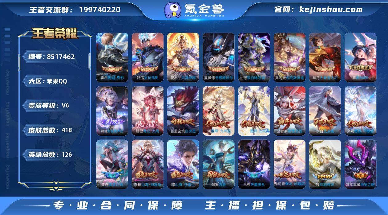 实名: 可修改 性别: 女号 贵族等级: V6 英雄数: 126 皮肤数: 418 荣耀水晶: 武则天,倪克斯神谕,无限飓风号,大秦宣太后,鸣剑·曳影,九霄神辉,银白咏叹调,弑枪猎影 无双皮: 真我赫兹(瑶),青丘·九尾,韩信群星魔术团 传说皮: 黄金狮子座,黄金射手座,冠军飞将,云鹰飞将,绛天战甲,黄金白羊座,猫影幻舞,久胜战神,炽阳神光,一念神魔,云霓雀翎,末日机甲-孙尚香,地狱火,仲夏夜之梦,音你心动-小乔,零号·赤焰,海洋之心,地狱之眼,飞鸢探春,胖达荣荣,乞巧织情,时之恋人-刘备,游龙清影,淬星耀世,超时空战士-狄仁杰,遇见胡旋,末日机甲-孙策,无双飞将,音你闪耀,碎云,神器·狴犴令,山海·炽霜斩,山海·琳琅生,山海·苍雷引,炽翼辉光,浮生妄,鹤羽星尊,妄想实况,艾琳觅芳踪,乘龙·问璇玑,乘龙·铭钟鼎,落雪白狼,黄金天蝎座,云中君群星魔术团,启明星使,幻光神枪,星之鸣奏 限定皮: 冰锋战神,遇见飞天,李小龙,祈雪灵祝,游园惊梦,梁祝,御风骁将,时雨天司,引擎之心,玄嵩,白晶晶,岱宗,天魔缭乱,神威,幽恒,时之彼端,飞衡,太华,天狼运算者,逐梦之影,天狼绘梦者,凤求凰,白虎志,至尊宝,一生所爱,如梦令-后羿,大圣娶亲,霸王别姬-虞姬,高山流水,猪悟能,傲雪梅枪,时之祈愿-云中君,五谷丰年,绯月行,诗剑行,怒海麟威,山海·玄木吟,山海·碧波行,齐天大圣,无限倾心-虞姬,无限倾心-项羽,愿照·千秋盛,愿照·山河定,愿照·九州拓