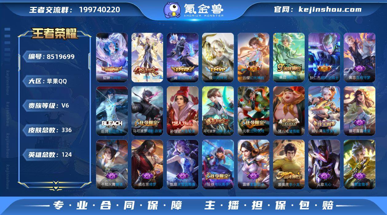实名: 可修改 性别: 女号 贵族等级: V6 英雄数: 124 皮肤数: 336 荣耀水晶: 幻阙歌 传说皮: 炽阳神光,超时空战士-狄仁杰,澜逐花归海,幻光神枪 限定皮: 遇见飞天,李小龙,梁祝,逐梦之星,如梦令-后羿,大圣娶亲,高山流水,猪悟能,匿光追影者,五谷丰年,山海·玄木吟,鸣野蒿,愿照·山河定