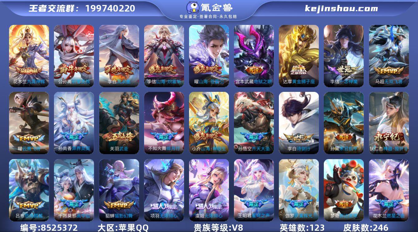 苹果QQ/ 246皮肤/ 123英雄 【1 典藏皮肤】九霄神辉 花木兰,【27 传说皮肤】胖达荣荣 梦奇,武圣 关羽,星穹之声 王昭君,启明星使 虞姬,无限倾心 虞姬,无双飞将 马超,云鹰飞将 曜