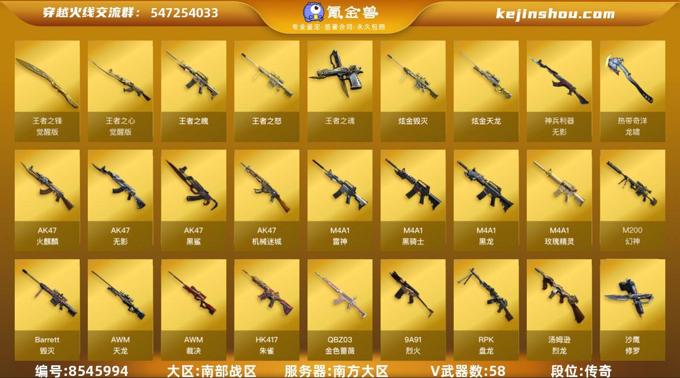 实名: 可修改 排位资格: 有 V武器: AK47-火麒麟,AK47-无影,AK47-黑鲨,AK47-机械迷城,M4A1-雷神,M4A1-黑骑士,M4A1-黑龙,M4A1-玫瑰精灵,Barrett-毁灭,AWM-天龙,AWM-裁决,M200-幻神,HK417-朱雀,QBZ03-金色蔷薇,9A91-烈火,RPK-盘龙,汤姆逊-烈龙,沙鹰-修罗,沙鹰-天神,屠龙,麒麟刺,USP-雷暴,斩神刀-雷暴,裁决,烈龙,盘龙,天神,修罗,龙啸-热带奇洋,无影-神兵利器 王者武器: 王者之魄,王者之怒,王者之魂,王者之心-觉醒版,王者之锋-觉醒版 炫金武器: 炫金毁灭,炫金天龙 狙击枪稀有皮肤: 毁灭-星空,天龙-CF STAR,天龙-能量核心,AWM-天龙-传奇白鲨 英雄角色: 王者-零,樱,传说艾莉莎,兰-海滩派对,王者春,职业选手 音效道具: M4A1-黑骑士音效卡