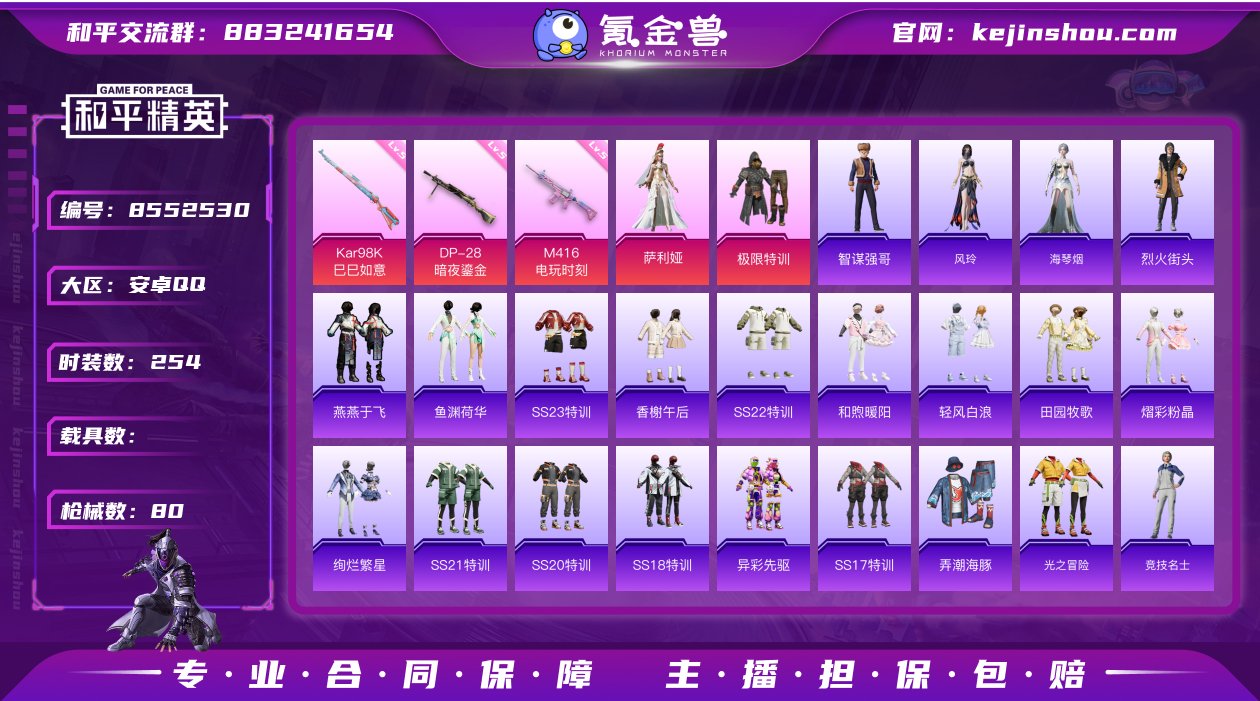 可实名安卓Q-地铁高天赋 2粉3特效枪 热门雷霆特警61个套装80个枪皮肤 时装数: 254 枪械数: 80 战备数: 45 热门装扮: 极限特训,萨利娅 稀有枪皮: DP-28暗夜鎏金,M416电玩时刻,Kar98K-巳巳如意