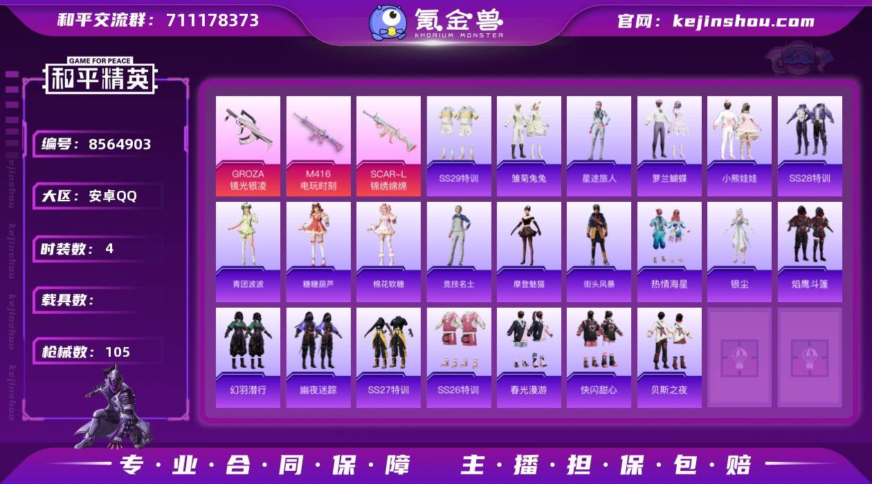 实名: 可修改 时装数: 4 枪械数: 105 稀有枪皮: SCAR-L-锦绣绵绵,M416电玩时刻,GROZA-镜光银凌