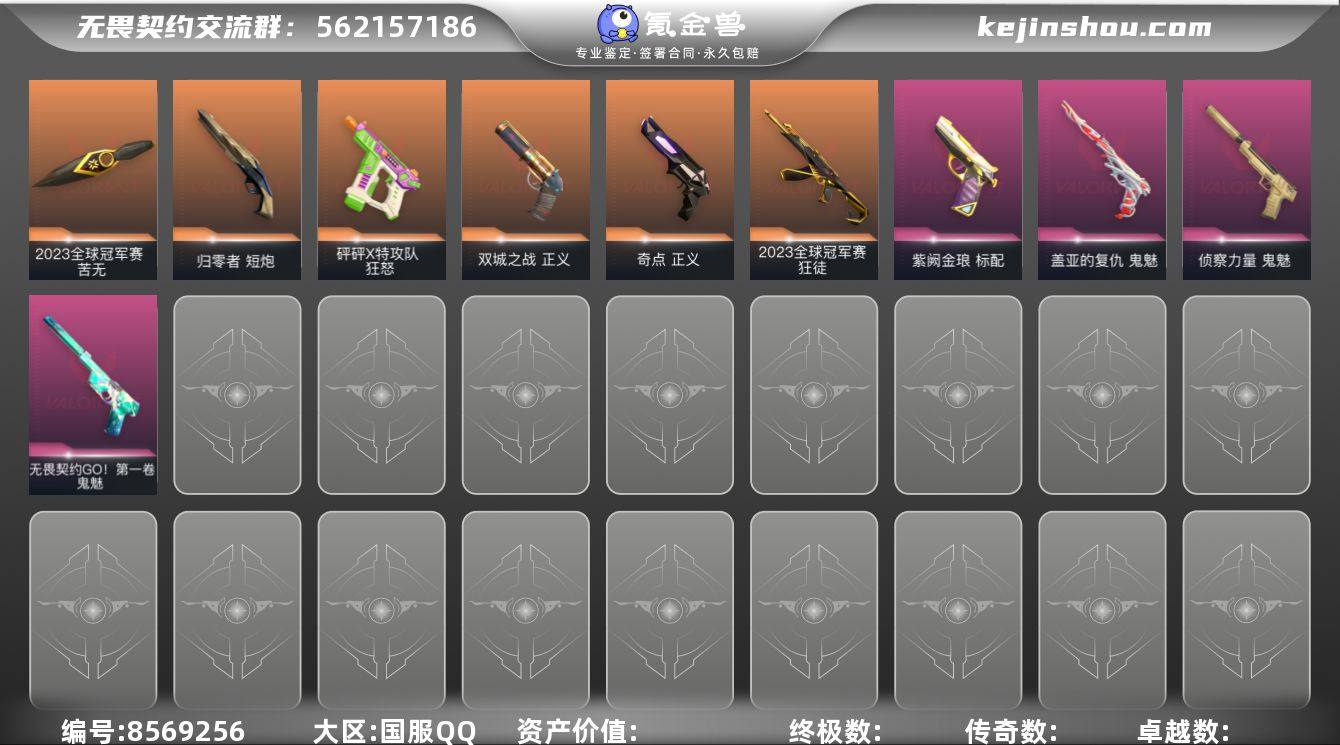 【套装】:2025全球冠军赛套装,2022全球冠军赛套装,末日泡泡套装,滋滋X特攻队套装,噬影者套装,VCT 2025 赛季套装,创·纪元套装 【英雄】:幻棱,炼狱,钛狐,捷风,不死鸟,贤者,猎枭,芮娜,霓虹 【近战 武器】:近战武器-2025全球冠军赛 蝴蝶刀,近战武器-2022全球冠军赛 蝴蝶刀,近战武器-泡泡电锯,近战武器-嘟昂嘟昂超弹力水球拳套,近战武器-VCT 2025 爪刀,近战武器-紫金爪刀,近战武器-黑波之刃,近战武器-落英飞旋,近战武器-噬影者 簇刃,近战武器-镭切,近战武器-荒土机兵 热能刀,近战武器-天御刀,近战武器-诡秘蛇影 军刀,近战武器-神圣领域 战刀 【狂徒】:狂徒-艾沃莉的梦之翼,狂徒-2025全球冠军赛,狂徒-混沌序曲,狂徒-机动狂飙,狂徒-全息波普//2.0,狂徒-创·纪元,狂徒-噬影者,狂徒-滋滋X特攻队,狂徒-冰点凝冻,狂徒-日冕雄师,狂徒-离子武器//2.0,狂徒-荒土机兵,狂徒-诡秘蛇影 【幻影】:幻影-2022全球冠军赛,幻影-砰砰X特攻队,幻影-千灵华绽,幻影-末日泡泡,幻影-侦察力量,幻影-神圣领域,幻影-纳米打击,幻影-末日之翼 【戍卫】:戍卫-噬影者,戍卫-逆冲蛮牛,戍卫-月球哨兵,戍卫-折光棱晶 【獠犬】:獠犬-神圣领域,獠犬-逆冲蛮牛 【冥驹】:冥驹-滋滋X特攻队,冥驹-末日泡泡,冥驹-荒土机兵,冥驹-星云暗涌 【飞将】:飞将-末日之翼 【莽侠】:莽侠-创·纪元,莽侠-诡秘蛇影,莽侠-月球哨兵 【战神】:战神-神圣领域 【奥丁】:奥丁-纳米打击,奥丁-末日之翼 【判官】:判官-诡秘蛇影,判官-纳米打击x 【雄鹿】:雄鹿-逆冲蛮牛,雄鹿-月球哨兵 【骇灵】:骇灵-光明哨兵//2.0,骇灵-创·纪元,骇灵-荒土机兵,骇灵-无限竞技,骇灵-星云暗涌 【蜂刺】:蜂刺-噬影者,蜂刺-末日泡泡,蜂刺-星云暗涌,蜂刺-折光棱晶 【标配】:标配-堕天遗武,标配-荒土机兵,标配-折光棱晶 【...