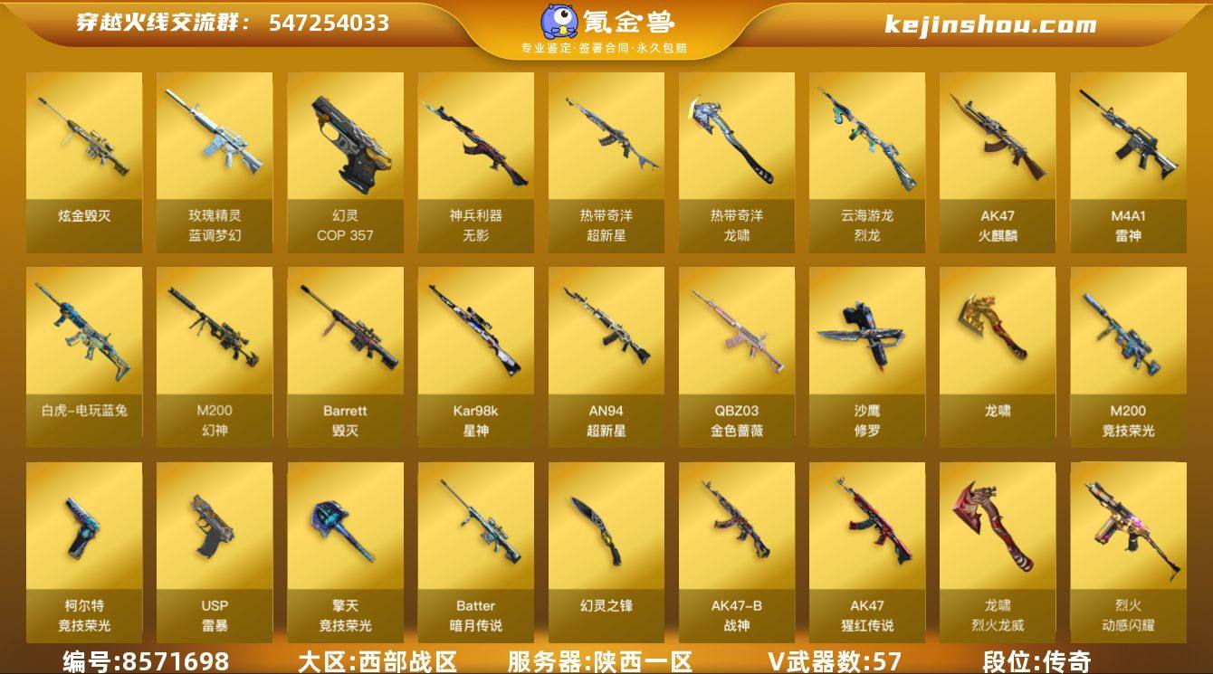 实名: 可修改 排位资格: 有 V武器: AK47-火麒麟,M4A1-雷神,Barrett-毁灭,M200-幻神,Kar98k-星神,AN94-超新星,QBZ03-金色蔷薇,沙鹰-修罗,龙啸,M200-竞技荣光,柯尔特-竞技荣光,USP-雷暴,擎天-竞技荣光,Barrett-暗月传说,幻灵之锋,AK47-B-战神,AK-47-猩红传说,修罗,白虎-电玩蓝兔,龙啸-烈火龙威,烈火-动感闪耀,天神-动感闪耀,屠龙-动感闪耀,屠龙-云海游龙,擎天-云海游龙,烈龙-云海游龙,龙啸-热带奇洋,超新星-热带奇洋,无影-神兵利器,COP 357-幻灵,玫瑰精灵-蓝调梦幻 炫金武器: 炫金毁灭 狙击枪稀有皮肤: 幻神-冠军之幻,幻神冠军之幻,毁灭-枪娘格雷姐妹 英雄角色: 鹰,王者影豹,星际战将