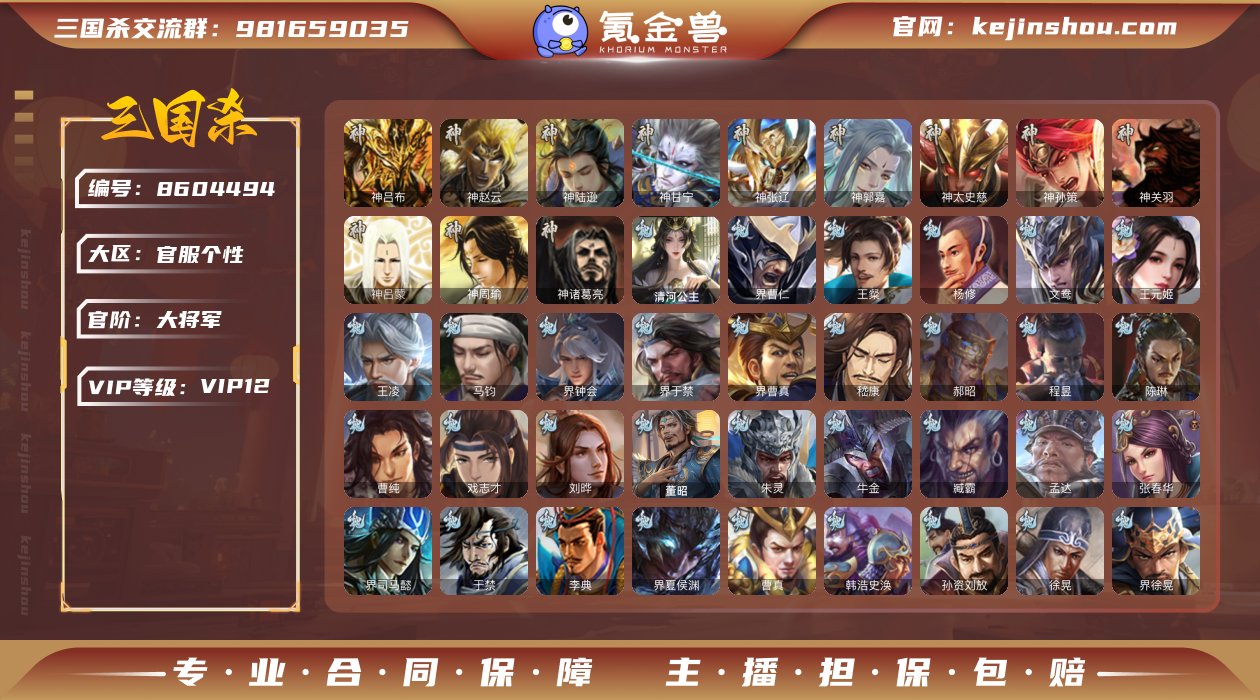 斗王5次,最高连胜17,全场最佳2300,胜率60以上,心愿分15000。武将、动皮全,神郭嘉、神甘宁、神孙策、神太史慈、神赵、神陆逊、神吕布、小鸟、界终会、戏子、王元姬、马钧、谋诸葛、谋马超、张星彩、沙摩柯、骆统、大宝、歌王、界左慈、许攸、杜宇、界李儒、沮授、张让、白马、徐荣、猴子、南华等等,皮肤也多,银币元宝若干。