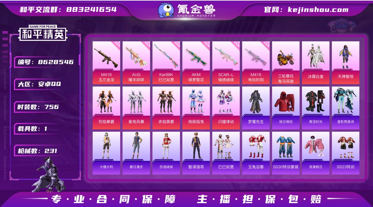 实名: 可修改 时装数: 756 载具数: 1 枪械数: 231 战备数: 143 热门装扮: 冰霜白皇,天禅智恒,烈焰拳霸,紫电风暴,赤焰黑爵,绚丽摇曳,闪耀律动,梦魇先生 载具: 鬼马风驰 稀有枪皮: AUG-暖羊咩咩,Kar98K-巳巳如意,M416电玩时刻,M416五爪金龙,AKM绿萝繁花,SCAR-L-锦绣绵绵 紫色装扮: 旭日情侣,青涩时光,星影赞美诗,大橘大利,春日漫步,恋语绒绒,智谋强哥,巳巳如意,玉兔迎春,红酒骑士,SS9特训,SS8特训,闪耀星光,精神漫游,SS7特训,SS6特训,原初圣火,逆风勇士,SS12特训,SS11特训,耀粉歌者,镭射皇者,猎梦纪元,SS20特训,甜心亚梦,娇憨猪猪,萌趣咩咩,虚音幻奏,SS21特训,英勇保护者,飞驰魅影,音速流光,SS19特训,SS23特训,浪漫假日,SS30特训套装,SS22特训,特种颜团子,SS15特训,萌趣颜团子,娴静芝兰,闪金天王,银白舞王,SS13特训,SS14特训,冰爽海盐,治愈之星,迅捷之星,科技之星,艾克斯奥特曼,豚鼠丹丹,SS17特训,异彩先驱,SS18特训,水晶王族,双棍侠客,闪银刀客,时空追击者,暴风机械师,星辰守护者,SS16特训,电音精灵,Mark.06,8号机,SS29特训,星途旅人,多纳泰罗,焰鹰斗篷,幽夜迷踪,贝斯之夜,快闪甜心,春光漫游,SS26特训,幻羽潜行,宝石天鹅,SS28特训,SS27特训,摇滚战魂,水银刺客,金耀舞者,恶魔宝贝,萌黄之夏,青玉碎影,紫翼圣骑,光之冒险,竞技名士,SS24特训,惊鸿侠骨,SS25特训,锦衣飞扬,浪漫天命,日照花林 亮点: 新款螳螂副套两个,五爪金龙