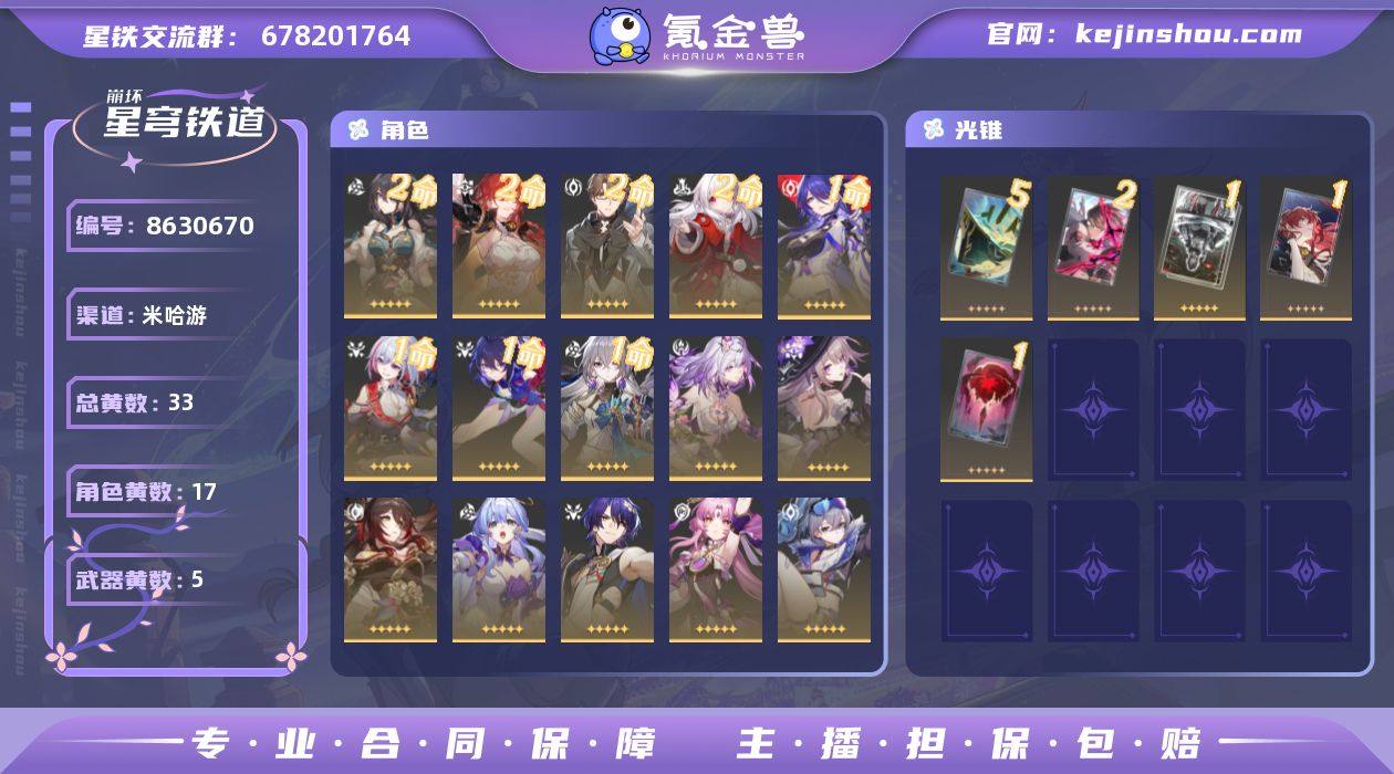 总黄数: 33 2命金色角色: 2命姬子,2命瓦尔特,2命克拉拉,2命阮•梅 1命金色角色: 1命希儿,1命布洛妮娅,1命托帕&账账,1命黄泉 0命金色角色: 0命彦卿,0命杰帕德,0命银狼,0命符玄,0命真理医生,0命知更鸟,0命忘归人,0命大黑塔,0命遐蝶 精5武器: 精5星海巡航 精2武器: 精2以世界之名 精1武器: 精1银河铁道之夜,精1记一位星神的陨落,精1行于流逝的岸
