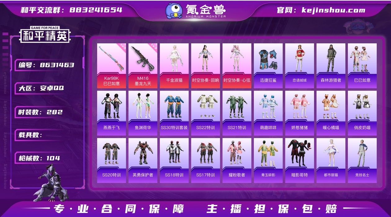 实名: 可修改 时装数: 282 枪械数: 104 战备数: 64 热门装扮: 千金淑猫,时空协奏·回响,时空协奏·心弦,迅捷狂鲨 稀有枪皮: Kar98K-巳巳如意,M416墨龙九天 紫色装扮: 恋语绒绒,巳巳如意,森林游猎者,燕燕于飞,鱼渊荷华,耀粉歌者,SS20特训,俏皮奶喵,暖心橘喵,娇憨猪猪,萌趣咩咩,SS21特训,英勇保护者,SS30特训套装,SS22特训,SS17特训,SS18特训,小熊娃娃,粉日山川,Mark.06,萝兰蝴蝶,雏菊兔兔,SS29特训,曼妙人鱼,热情海星,纯真浪花,银尘,SS27特训,青玉碎影,暗影哥特,都市丽猫,竞技名士,棉花软糖,青团波波,糖糖葫芦 亮点: 各个游戏都有实力