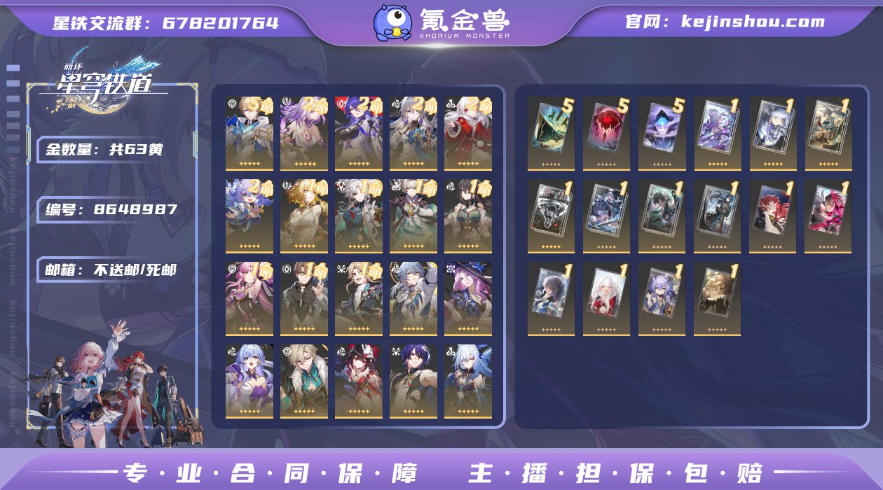邮箱: 不送邮/死邮 开拓者性别: 男 总黄数: 63 开拓等级: 70 金色角色: 罗刹,银狼,刃,希儿,景元,彦卿,白露,瓦尔特,布洛妮娅,克拉拉,杰帕德,丹恒•饮月,符玄,镜流,阮•梅,真理医生,花火,黄泉,砂金,知更鸟,流萤,翡翠,飞霄,星期日,阿格莱雅,遐蝶 拥有武器: 到不了的彼岸,如泥酣眠,时节不居,银河铁道之夜,以世界之名,但战斗还未结束,无可取代的东西,比阳光更明亮的,此身为剑,记忆的质料,记一位星神的陨落,星海巡航,行于流逝的岸,我将,巡征追猎,回到大地的飞行,让告别,更美一些 亮点: 2+1遐蝶 1+0阿格莱雅 0+1星期日 2+1黄泉 1+0阮梅 1+0流萤 up主c几乎都有专武