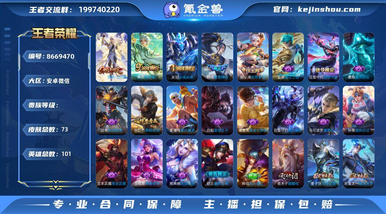 实名: 可修改 性别: 女号 英雄数: 101 皮肤数: 73 限定皮: 冰锋战神,傲雪梅枪,鸣野蒿,逐霄战戟,愿照·山河定
