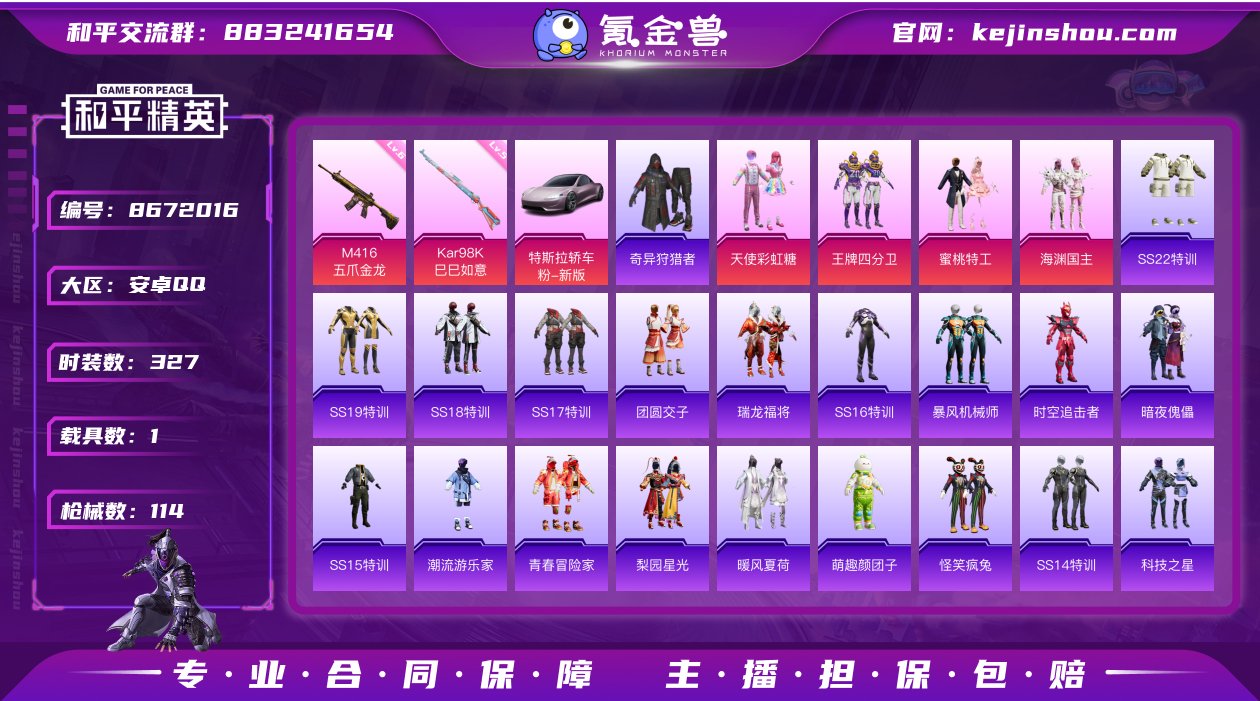 4粉2特1车-37587热力值 2王牌印记 历史超级王牌 79套装 114枪皮 【1载具】 特斯拉R沁心粉 【1稀有】 奇异狩猎者 【4粉装】 天使彩虹糖 王牌四分卫 蜜桃特工 海渊国主 【2特效枪】 M416-五爪金龙 (6级) Kar98K-巳巳如意 (5级) 【1飞行器】 星之彼岸飞行器 【12热门】 裁决冥王 梨园星光 怪笑疯兔 团圆交子 瑞龙福将 粉红小猪 漫步者 梦之呓语 M416-梨园星光 M762-瑞龙福将 Kar98K-深海曼妙 AWM-激战未来 【2头盔】 梦幻火箭头盔 夏日绵绵冰头盔 【2背包】 深海小丑鱼背包 深海曼妙背包 营地ID:907546198
