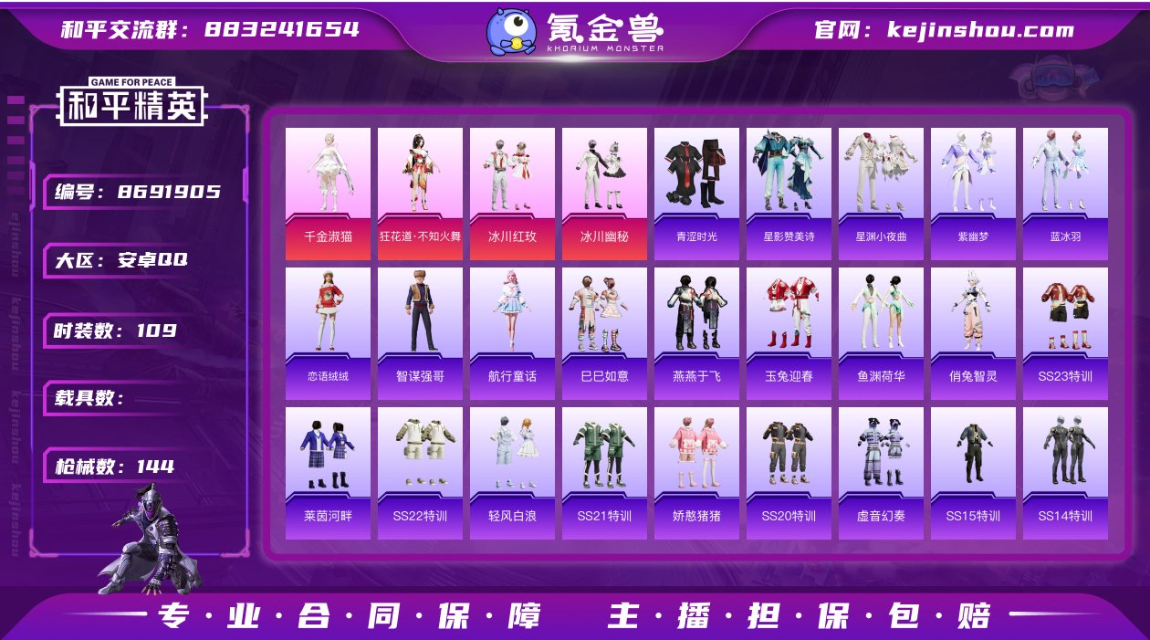 不知火舞/千金淑猫/红眼罩/狂沙舞者 6特效枪4粉装112套装144枪皮 5级UMP45相思残雪 4级PKM天星战神 1级爆炸猎弓拳皇狂花道 4级DP28千金淑猫 5级GROZA镜光银凌 5级Kar98K巳巳如意 冰川幽秘 冰川红玫 暗影哥特 浪漫天命 星渊小夜曲 星影赞美诗 紫幽梦 蓝冰羽 俏兔智灵 王牌印记7 热力值46699 可改实名 K14463 和平精英买号永久包赔带二次营地:729488402