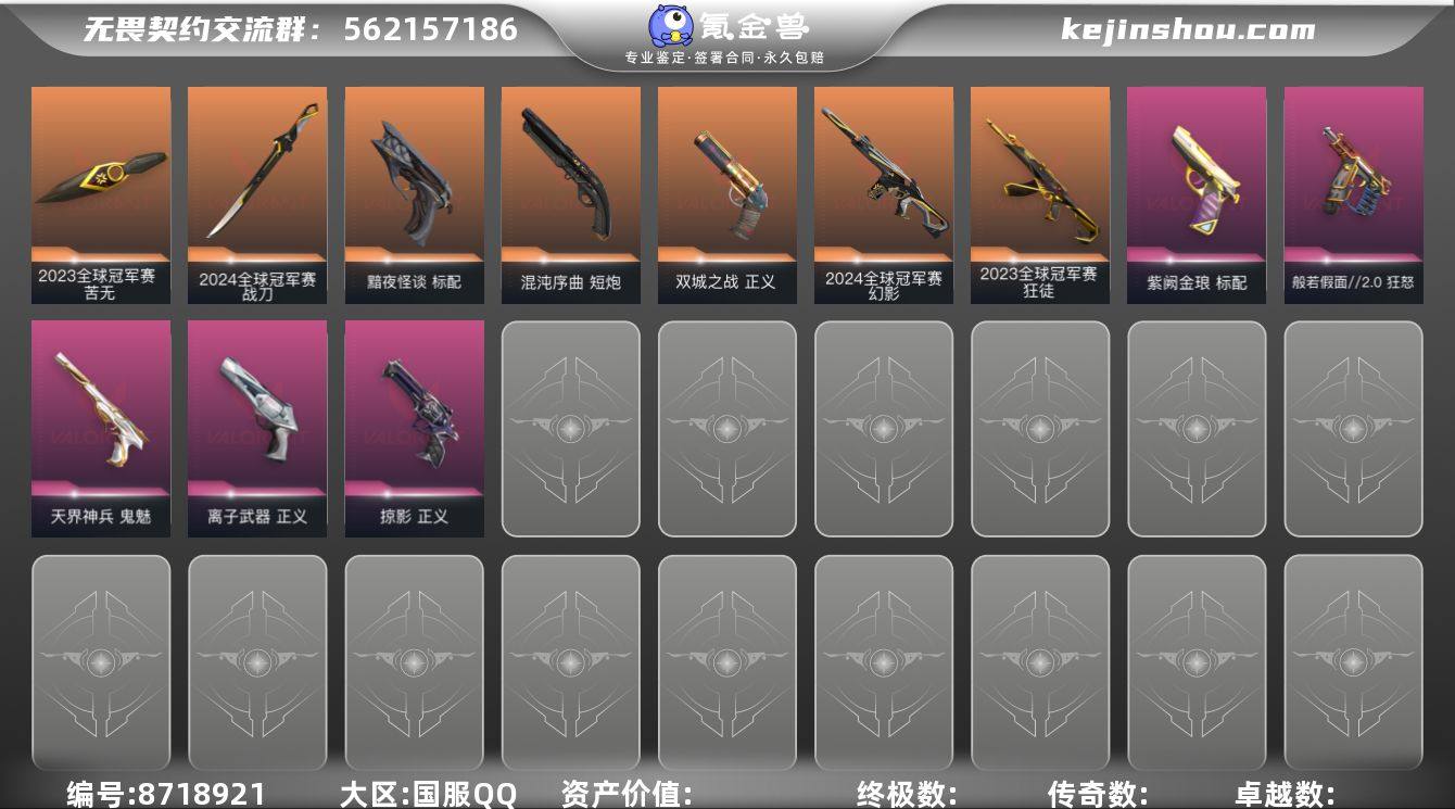 【套装】:《双城之战》收藏套装,混沌序曲套装,创·纪元套装,RGX 11z Pro//2.0套装,VCT 2025 赛季套装,噬影者套装,RGX 11z Pro套装,艾沃莉的梦之翼套装,上古龙炎套装,超时空卫队套装,千灵华绽套装,光明哨兵套装,黯夜怪谈套装,毁灭骑士套装,般若假面//2.0套装,掠影套装,黑市套装,日冕雄师套装,英雄之选套装,咒缚双界套装,离子武器//2.0套装,手工达人套装,星航勇进 【英雄】:幻棱,炼狱,维斯,暮蝶,钛狐,壹决,铁臂,捷风,雷兹,幽影,不死鸟,贤者,猎枭,蝰蛇,零,芮娜,奇乐,尚勃勒,霓虹,斯凯,夜露,星礈,K/O,海神,盖可,黑梦,钢锁 【近战 武器】:近战武器-RGX 11z Pro//3.0 爪刀,近战武器-VCT 2025 爪刀,近战武器-RGX 11z Pro//2.0 蝴蝶刀,近战武器-穿花蝴蝶,近战武器-RGX 11z Pro 战刀,近战武器-超时空卫队 三棱军刺,近战武器-黑波之刃,近战武器-落英飞旋,近战武器-噬影者 簇刃,近战武器-镭切,近战武器-艾沃莉的魔法棒,近战武器-鬼丸国纲,近战武器-离子武器//2.0 爪刀,近战武器-埃芒迪尔大剑,近战武器-双城之战 拳套,近战武器-龙爪,近战武器-混沌大剑,近战武器-超限闪存 匕首,近战武器-定海神珍,近战武器-盖亚之愠,近战武器-荒土机兵 热能刀,近战武器-毁灭战斧,近战武器-街机高手,近战武器-圣石遗物,近战武器-手工达人 战斧,近战武器-天界荣光,近战武器-夜刃诡镰,近战武器-影刃,近战武器-诡秘蛇影 军刀,近战武器-神圣领域 战刀 【狂徒】:狂徒-艾沃莉的梦之翼,狂徒-上古龙炎,狂徒-超时空卫队,狂徒-光明哨兵,狂徒-混沌序曲,狂徒-双城之战,狂徒-偃月苍龙,狂徒-创·纪元,狂徒-噬影者,狂徒-RGX 11z Pro,狂徒-般若假面//2.0,狂徒-冰点凝冻,狂徒-堕天遗武,狂徒-掠影,狂徒-盖世英雄,狂徒-黑市,狂徒-日冕雄师,狂徒-咒缚双界,狂徒-...