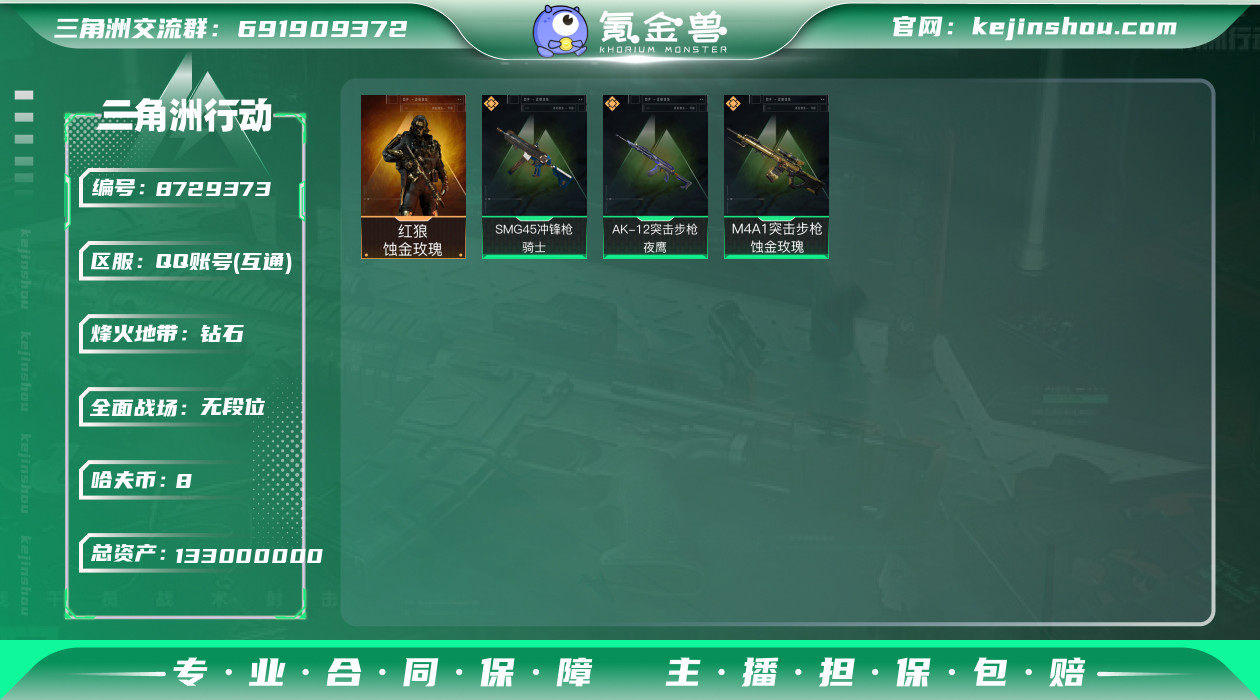 hf4691 总资产133m 纯币8m+s4赛季3x3安全箱+蚀金玫瑰红狼全套+s4赛季通行证+烽火等级60 特勤部门等级很高 永久包赔