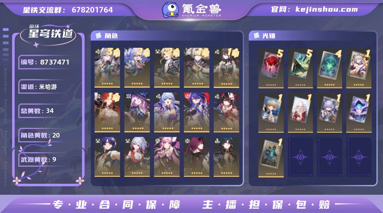 总黄数: 34 3命金色角色: 3命布洛妮娅 2命金色角色: 2命彦卿,2命白露 1命金色角色: 1命姬子,1命阮•梅,1命流萤 0命金色角色: 0命希儿,0命瓦尔特,0命杰帕德,0命银狼,0命罗刹,0命刃,0命卡芙卡,0命符玄,0命托帕&账账,0命真理医生,0命花火,0命黄泉,0命知更鸟,0命翡翠 精5武器: 精5记一位星神的陨落,精5星海巡航 精4武器: 精4不息的演算 精1武器: 精1时节不居,精1制胜的瞬间,精1无可取代的东西,精1记忆的质料,精1孤独的疗愈,精1夜色流光溢彩