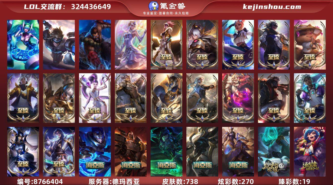 皮肤数:738 炫彩数:270 臻彩皮肤总数:19 神话皮肤数:25 限定皮肤数:144 传说皮肤数:88 英雄数:170 卖家说:限定皮肤和至臻多,还有黑龙炫彩