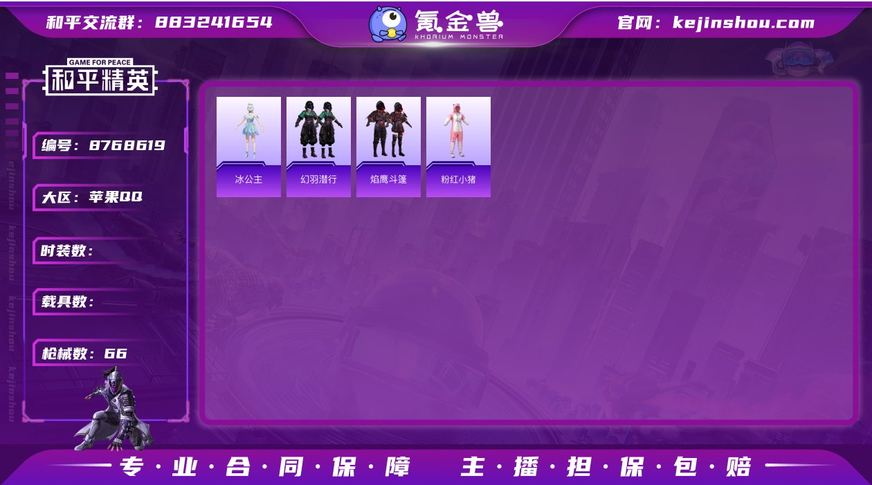 [8820794]2粉装 4特效枪 3印记 可二次 可修改实名 热门装扮:女娲灵识,千金淑猫 稀有枪皮:GROZA-镜光银凌,Kar98K-巳巳如意,M416电玩时刻,SCAR-L-锦绣绵绵 五级特效枪:五级GROZA-镜光银凌,五级Kar98K-巳巳如意,五级SCAR-L-锦绣绵绵,五级M416-电玩时刻 紫色装扮:智谋强哥,SS32特训服(SS32特训套装),春光漫游,粉红小猪,快闪甜心,萌趣绒叽,SS27特训,幽夜迷踪,幻羽潜行,焰鹰斗篷,青团波波,街头风暴,摩登魅猫,都市丽猫,竞技名士,棉花软糖,糖糖葫芦,星途旅人,巳巳如意,燕燕于飞,鱼渊荷华,SS28特训,冰公主,Alan Walker,SS29特训 优质战备:莲影清波降落伞,动力核心降落伞,千金淑猫降落伞,星途旅人降落伞