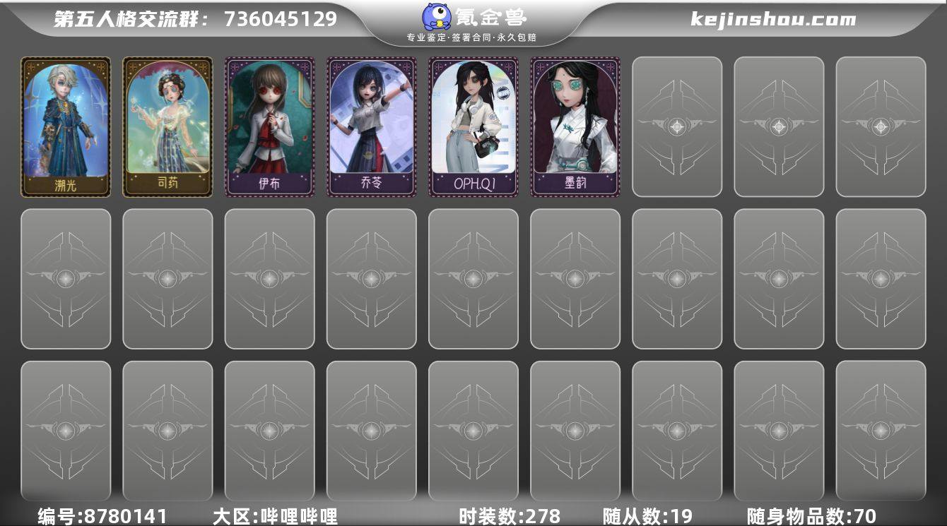 古董商的皮肤除了白泽都有,求生者的比较多,(这个号是b服的,顺带还有决战平安京和阴阳师一起售卖。平安京的皮肤挺多的。还有库洛米和玉桂狗的限定皮肤)。这个号是b服的,顺带还有(决战平安京)和《阴阳师》一起售卖。这三个号都是玩了挺久的,但是现在好久不打游戏了,准备把号出了 打包把B站号一起售卖