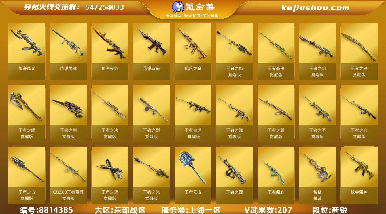实名: 可修改 排位资格: 有 V武器: AK47-火麒麟,AK47-无影,AK47-雷暴,AK47-黑鲨,AK47-黑武士,AK47-麒麟,AK47-机械迷城,M4A1-雷神,M4A1-黑骑士,M4A1-死神,M4A1-黑龙,M4A1-青龙,M4A1-武圣,M4A1-猎神,M4A1-玫瑰精灵,传说暗裔,Barrett-毁灭,Barrett-极光,Barrett-朱雀,AWM-天龙,AWM-裁决,M200-幻神,Kar98k-星神,AA-12-雷霆,AN94-超新星,AK12-天启,HK417-朱雀,QBZ03-金色蔷薇,Scar Light-白虎,9A91-烈火,RPK-盘龙,汤姆逊-烈龙,加特林-炼狱,沙鹰-修罗,沙鹰-天神,屠龙,龙啸,麒麟刺,擎天,M200-竞技荣光,柯尔特-竞技荣光,USP-雷暴,擎天-竞技荣光,AK47-B-常胜将军,Barrett-暗月传说,斩神刀-雷暴,幻灵之锋,AK47-B-战神,AK-47-猩红传说,传说辉光,裁决,烈龙,盘龙,天神,修罗,白虎-电玩蓝兔,柯尔特-冠军之特,M14EBR-玄武,传说夜影,炽芒蝶刃,传说灵眸,G36C-幻影,烈火-动感闪耀,天神-动感闪耀,屠龙-动感闪耀,擎天-云海游龙,Glock18-武圣,烈龙-云海游龙,无影-神兵利器,雷霆之契 王者武器: 炼狱-悦蓝,王者霜心,王者之霆,王者云击,凤吟之魄,王者之光-觉醒版,王者之魂-觉醒版,QBZ-03-王者蔷薇-觉醒版,王者之击-觉醒版,王者之心-觉醒版,王者之圣-觉醒版,王者之翼-觉醒版,王者之魄-觉醒版,王者白虎-觉醒版,王者之烈-觉醒版,王者之决-觉醒版,王者之刺-觉醒版,王者之啸-觉醒版,王者之锋-觉醒版,王者之幻-觉醒版,王者森决-觉醒版,王者之怒-觉醒版 炫金武器: 炫金毁灭,炫金雷神,炫金黑龙,炫金天龙,炫金超新星,炫金修罗 狙击枪稀有皮肤: 毁灭-暗月,毁灭-荣耀之怒,毁灭-冠军之怒,毁灭-战神张飞,M200-幻神-黄忠,幻神-冠军之幻,天龙-秘银,天龙-能量核心,幻神冠军之幻,幻神-宠儿,毁灭-枪娘格雷姐妹,毁灭-直播专属,幻神-CFS2022,幻神-巅峰荣耀 英雄角色: 审判者,王者-零,王者复仇,王者葵-惊若翩鸿,春,瞳,樱,葵,零,魅影,传说女帝,雨棠,电竞教官-云悠...