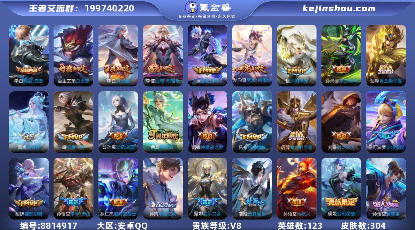 实名: 可修改 贵族等级: V8 英雄数: 123 皮肤数: 304 荣耀水晶: 鸣剑·曳影 传说皮: 黄金狮子座,黄金射手座,云鹰飞将,猫影幻舞,炽阳神光,云霓雀翎,末日机甲-孙尚香,地狱火,仲夏夜之梦,零号·赤焰,时之恋人-刘备,超时空战士-狄仁杰,挚爱之约,山海·炽霜斩,记忆之芯,妄想实况,霜月吟,澜逐花归海,乘龙·问璇玑,启明星使 限定皮: 冰锋战神,遇见飞天,李小龙,梁祝,引擎之心,岱宗,逐梦之音,天狼狩猎者,冰霜恋舞曲,逐梦之影,凤求凰,白虎志,至尊宝,一生所爱,高山流水,孙行者,启示之音,五谷丰年,怒海麟威,山海·玄木吟,鸣野蒿,逐霄战戟 亮点: 安卓QQ/ 304皮肤/ 123英雄 【1 典藏皮肤】鸣剑·曳影 李白,【25 传说皮肤】启明星使 虞姬,云霓雀翎 虞姬,逐花归海 澜,白虎志 百里玄策,零号·赤焰 孙悟空,地狱火 孙悟空,云鹰飞