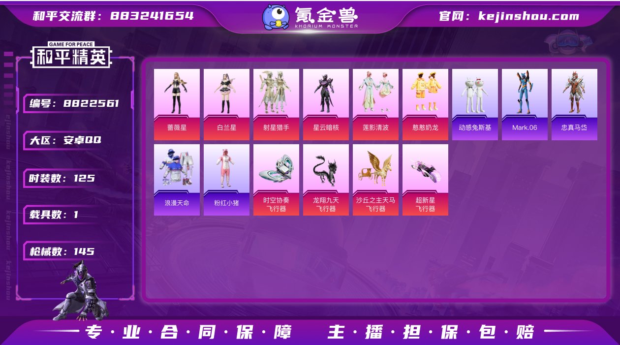 [8920877]8粉装 7特效枪 1载具 5印记 可二次 可修改实名 身法装备:暗影哥特(红眼罩),Mark.06(新蓝螳螂) 热门装扮:未来领航者,蔷薇星,白兰星,射星猎手,宙之时溯,星云暗核,莲影清波,憨憨奶龙,动感兔斯基 载具:宾利飞驰(布罗德盖棕双色) 稀有枪皮:GROZA-镜光银凌,Kar98K-巳巳如意,UMP45启明星,M416超新星,AUG超新星,AKM绿萝繁花,M24镜域双华 七级特效枪:七级AUG-超新星,七级UMP45-启明星 六级特效枪:六级M416-超新星 五级特效枪:五级GROZA-镜光银凌,五级Kar98K-巳巳如意,五级AKM-绿萝繁花 三级特效枪:三级M24-镜域双华 紫色装扮:瑰梦爱神,蓝调潮影,晶辉守护,智谋强哥,春日漫步,SS32特训服(SS32特训套装),紫幽梦,蓝冰羽,恋语绒绒,云霞荷露,忠真马岱,春光漫游,日照花林,华灯初上,甜心信使,甜星爱神,浪漫天命,粉红小猪,SS26特训,快闪甜心,萌趣绒叽,SS27特训,锦衣飞扬,金戈铁马,SS25特训,惊鸿侠骨,青团波波,街头风暴,竞技名士,棉花软糖,糖糖葫芦,星途旅人,先驱飞行员,石蕴玉辉,巳巳如意,燕燕于飞,鱼渊荷华,临安公主,暗影哥特(红眼罩),怀庆长公主,SS28特训,热情海星,纯真浪花,白光莹,拉斐尔,SS29特训,萝兰蝴蝶,雏菊兔兔,粉日山川,Mark.06(新蓝螳螂) 优质战备:镜域双华-灵镜之阶,沙丘之主天马飞行器,龙翔九天飞行器,炫光之旅降落伞,莲影清波降落伞,万古烈焰降落伞,闲梦青缨降落伞,超新星降落伞,超新星飞行器,彩虹独角兽飞行器,凤舞九天飞行器,祥瑞起舞飞行器,雏菊兔兔降落伞,时空协奏飞行器,酣梦熊熊飞行器,临安公主降落伞,星途旅人降落伞,甜蜜草莓降落伞,洛神天依降落伞