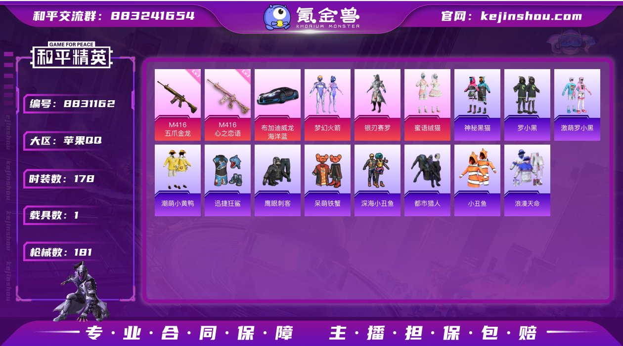 [8937376]3粉装 6特效枪 1载具 6印记 可二次 可修改实名 身法装备:都市猎人,暗影哥特(红眼罩) 热门装扮:梦幻火箭(新101)(新火箭少女101粉色套装),银刃赛罗,蜜语绒猫,神秘黑猫,罗小黑,激萌罗小黑,潮萌小黄鸭,迅捷狂鲨,鹰眼刺客,呆萌铁蟹,深海小丑鱼,都市猎人 载具:布加迪威龙(海洋蓝) 稀有枪皮:GROZA-镜光银凌,Kar98K-巳巳如意,AUG-暖羊咩咩,M416五爪金龙,M416心之恋语,AKM梦之光华 七级特效枪:七级M416-五爪金龙 六级特效枪:六级AKM-梦之光华 五级特效枪:五级GROZA-镜光银凌 四级特效枪:四级AUG-暖羊咩咩,四级Kar98K-巳巳如意 二级特效枪:二级M416-心之恋语 紫色装扮:冰冻风暴,SS27特训,Alan Walker,春光漫游,快闪甜心,贝斯之夜,粉日山川,雏菊兔兔,萝兰蝴蝶,SS29特训,纯真浪花,热情海星,SS28特训,SS26特训,小丑鱼,浪漫天命,SS32特训服(SS32特训套装),糖霜甜心,白糯汤圆,都市丽猫,青团波波,糖糖葫芦,竞技名士,绒宝小鹅,街头风暴,星途旅人,暗影哥特(红眼罩),鱼渊荷华,玉兔迎春,燕燕于飞,巳巳如意 优质战备:星途旅人降落伞,垂柳戏鸭降落伞,暗夜鎏金降落伞,银刃赛罗降落伞,葫芦兄弟降落伞,机甲封神降落伞