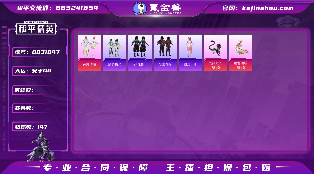[8935774]3粉装 4特效枪 4印记 可二次 可修改实名 热门装扮:狂花道·不知火舞,千金淑猫,莲影清波,绿野极光 稀有枪皮:爆炸猎弓-拳皇·狂花道,DP-28-千金淑猫,SVD-月影灵韵,Kar98K-巳巳如意 七级特效枪:七级爆炸猎弓-拳皇·狂花道 六级特效枪:六级DP-28-千金淑猫 五级特效枪:五级Kar98K-巳巳如意 三级特效枪:三级SVD-月影灵韵 紫色装扮:智谋强哥,SS32特训服(SS32特训套装),恋语绒绒,风玲,云霞荷露,春光漫游,粉红小猪,SS26特训,快闪甜心,萌趣绒叽,SS27特训,幻羽潜行,焰鹰斗篷,贝斯之夜,无暇誓言,锦衣飞扬,SS24特训(SS24特训套装),懵萌河马,神气柴柴,金戈铁马,SS25特训,惊鸿侠骨,青团波波,摩登魅猫,都市丽猫,绒宝小鹅,竞技名士,棉花软糖,糖糖葫芦,星途旅人,石蕴玉辉,烈火街头,巳巳如意,燕燕于飞,玉兔迎春,鱼渊荷华,临安公主,粉雾星云,创世·幻影,SS28特训,曼妙人鱼,热情海星,纯真浪花,SS29特训,萝兰蝴蝶,雏菊兔兔,小熊娃娃 优质战备:镜域双华降落伞,镜域双华-灵镜之阶,绝色倾城飞行器,圣堂之誓降落伞,龙翔九天飞行器,萌物绒绒降落伞,樱桃泡泡降落伞,星梦奇缘降落伞,拳皇·狂花道降落伞,月影灵韵降落伞,星途旅人降落伞,千金淑猫降落伞,仲夏莫吉托降落伞