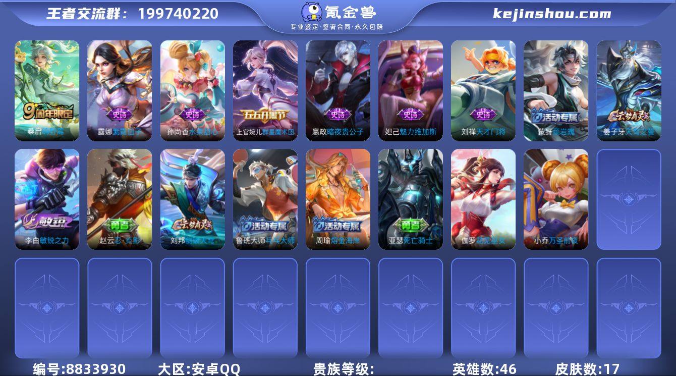 实名: 可修改 性别: 男号 英雄数: 46 皮肤数: 17 限定皮: 鸣野蒿