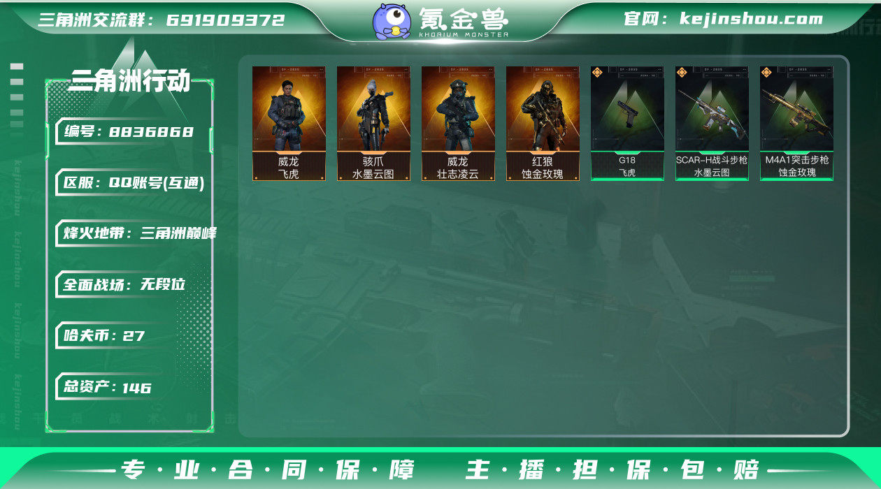 hf4902 总资产146m+纯币27m+蚀金玫瑰红狼全套+水墨云图骇爪全套+飞虎全套+s3s4赛季通行证+烽火等级60 特勤部门等级高 永久包赔