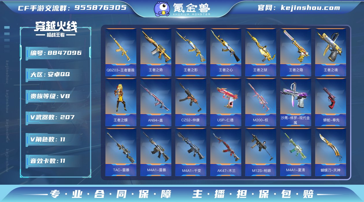 实名: 可修改 v武器数: 207 王者武器数: 19 V/王者角色数量: 11 音效卡数: 11 v武器: AN94-盖,CZS2-仲康,M16-恶魔,AWM-游骑兵,QBB95-再战涿鹿,VEPR12-本初,USP-雷暴,沙鹰-神兵修罗,COP357-堕天神,柯尔特-仲达,COP357-雷霆,虎头湛金枪,气手枪-血月,SCAR-印刷术,QBZ03-玉面羞花,汤姆逊-烈龙,M14EBR-拂影,迷你玉凝,蝴蝶刀-天神,M4A1-星象,AK47-游骑兵,USP-仁德,AK47-奉先,MK47-仁德,M200-幻神,M4A1-夏清,M12S-枪娘,TAC-慈,AK47-木兰,M4A1-千变,M4A1-雷暴,蟒蛇-奉先,TAC-雷暴,M4A1-游骑兵,M200-权,沙鹰-修罗-现代金属,M4A1-心动次元觉醒,M4A1-破空冰刃,M4A1-哈迪斯,MK47-云舞,81式-光明之神,M4A1-海骑士,AK47-血武士,MK47-机械纪元,AK47-雷麒麟,M4A1-雷霆,AK47-猩红传说,QBZ03-死神,M14EBR-天神,QBZ19-天使,AUG-机械纪元,AK47-黑鲨,M4A1-龙血,AK47-变色龙,SCAR-幽暗骑士觉醒,AK47-Rush-星速,QBZ03-金色蔷薇,M4A1-樱龙·二觉,AK12-天启,SCAR-幽暗骑士,M4A1-死神,M4A1-黑骑士,M4A1-雷神,AK47-火麒麟,巴雷特-冬灭觉醒,98K-血月,M200-心动次元觉醒,MR1-龙吟惊沧海,98K-黑骑士,AWM-裁决,巴雷特-金色蔷薇,09式狙-天神,暗杀神,巴雷特-极光,巴雷特-毁灭,AWM-天龙,加特林-蟒蛇,加特林-炼狱,加特林-堡垒,CZS2-心动次元觉醒,双持斯泰尔-天使,寒霜烈龙,KSG-火力竞放觉醒,贝雷塔-力拔山河,AA12-雷神,KSG-天使,地狱烈炎,地狱火,USP-机械迷城,MK23-幻神,MK23-机械纪元,沙鹰-幻兽,USP-神罚,沙鹰-修罗,唐刀-大唐荣耀,穷奇铁扇,手斧-机械迷城,丛林匕首-火力竞放觉醒,丛林匕首-火力竞放,尼泊尔-冰封觉醒,墨刃-幻神,斩神刀-雷暴,龙啸-堕天神,尼泊尔-机械纪元,尼泊尔-雷霆,白骨利刃,尼泊尔-竞界荣光,雌雄双股剑,血月,斩魔刀,星芒,擎天觉醒,麒麟刺,神罚战斧,马来剑-毁灭,屠龙,TAC-晴舞,M4A1-堕天神,迷你饕餮,CZ75-穷奇,柯尔特-伏刹山海觉醒,MR1-幽暗骑士,QCW05-变形金刚·大黄蜂,改装GLOCK-木兰,QBB95-极光,98K-星神,秋逸觉醒,PP19野牛-造纸术,方天画戟,SCAR-探星者,QSZ92-华夏传说 王者武器: QBZ03-王者蔷薇,王者之势,王者之影,王者之心,王者之狱,王者之隐,王者之魂,王者之蝶 v角色: 蔡文昭,云悠悠-心动起点,蜀雪,秦师,职场灵狐-赛事经理,晴雅,关小雨,瞳,樱 枪械皮肤: 王者之业-冰霜奇迹,MK47-鼓龙-白昼,麒麟刺-星空,AK47-火麒麟-不屈老兵,AK47-木兰-霓裳铁骑,AK47-竞界荣光-蜂鸟,王者之势-HeartShot,屠龙-星空,巴雷特-极光-不屈老兵,AK47-雷麒麟-火锅,巴雷特-毁灭-星空,GM6-战争风云觉醒,M4A1-死神-机甲核心,98K-黑骑士-能量核心,AK47-无影-暗月,沙鹰-无影-暗月,QBZ03-王者蔷薇-冰霜奇迹,M4A1-千变-随变,M4A1-黑骑士-现代金属,巴雷特-毁灭-枪娘,巴雷特-毁灭-不屈老兵,巴雷特-毁灭-枪神之怒,巴雷特-毁灭-暗月,AWM-天龙-英雄战甲,AWM-游