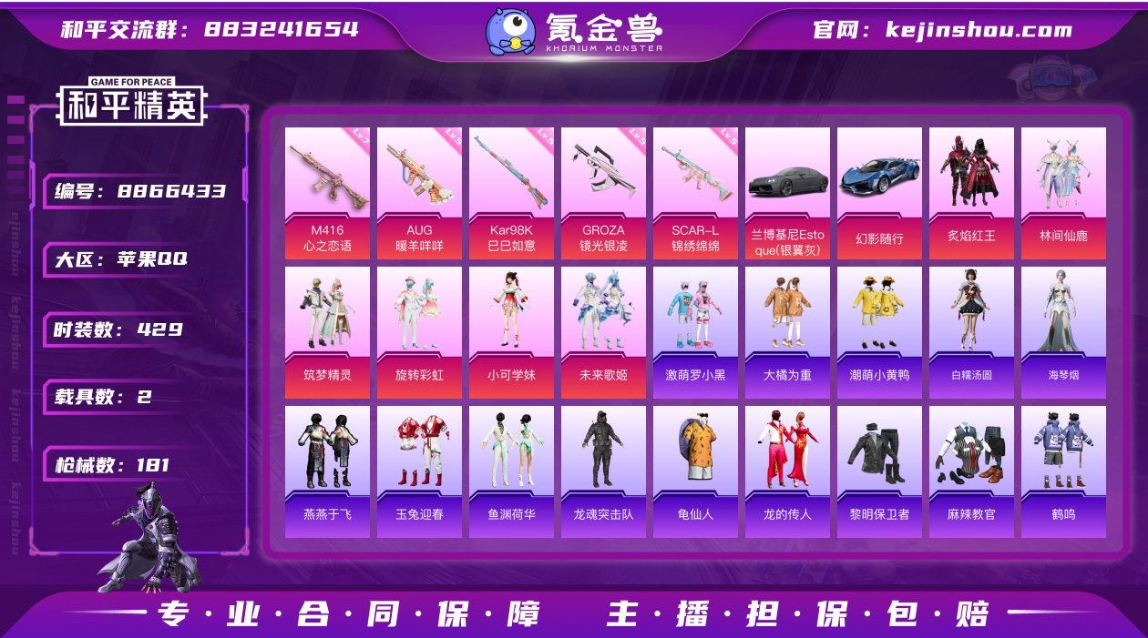可实名苹果Q-16印记-6粉5特效枪2载具2飞行器-小熊背包满级M4心之恋语116个套装181个枪皮肤 实名: 可修改 时装数: 429 载具数: 2 枪械数: 181 战备数: 133 热门装扮: 炙焰红王,林间仙鹿,筑梦精灵,旋转彩虹,潮萌小黄鸭,大橘为重,激萌罗小黑,小可学妹,未来歌姬 载具: 兰博基尼Estoque(银翼灰),幻影随行 稀有枪皮: M416心之恋语,SCAR-L-锦绣绵绵,GROZA-镜光银凌,Kar98K-巳巳如意,AUG-暖羊咩咩