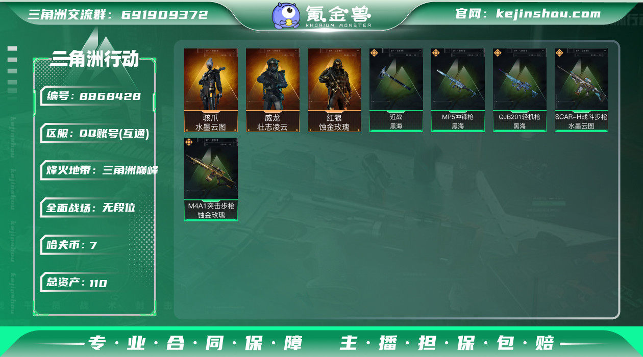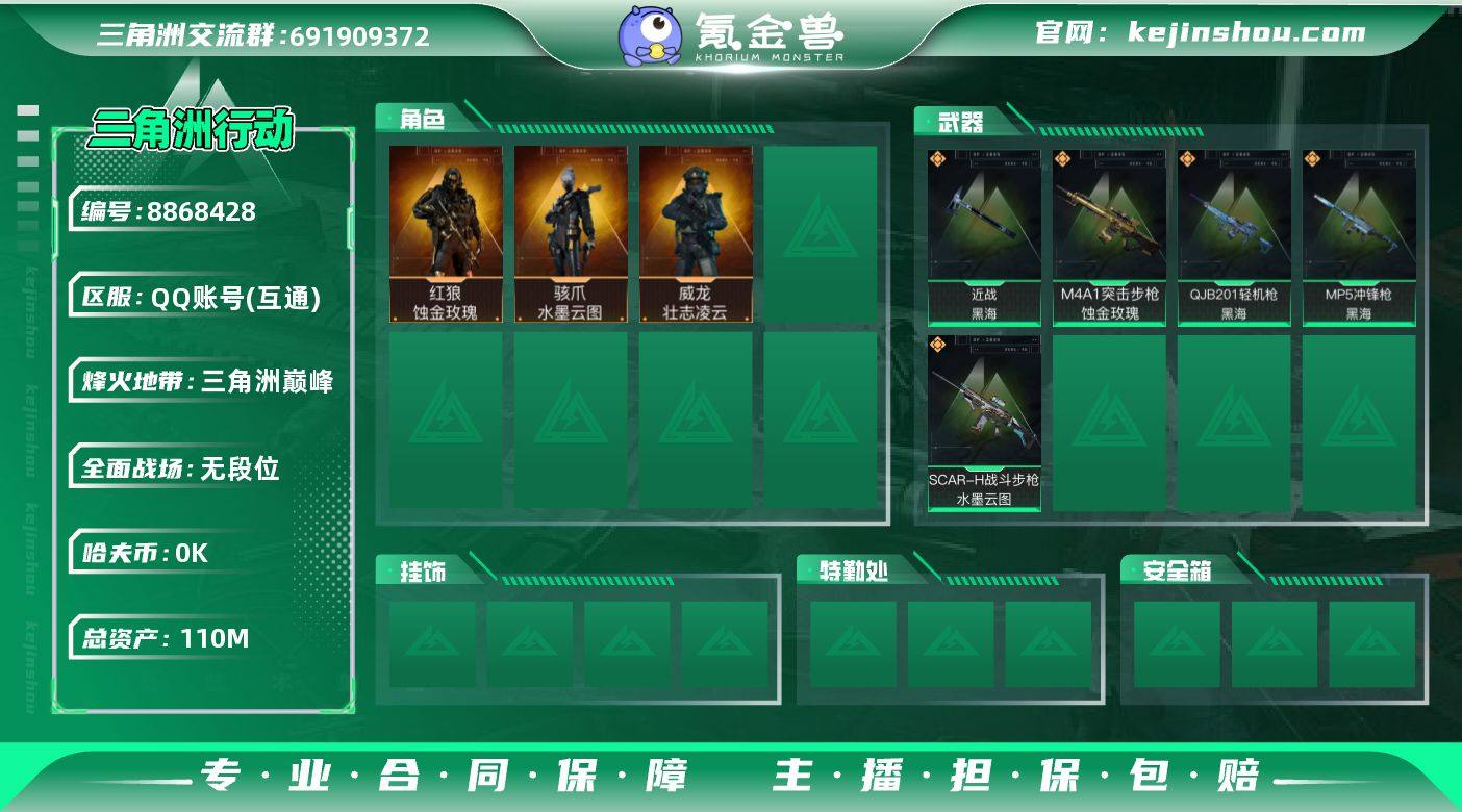 hf4976 总资产110m+纯币7m+s4赛季安全箱+蚀金玫瑰红狼全套+水墨云图骇爪全套+黑海全套+s3s4赛季通行证+烽火等级60 特勤部门等级高 s3s4赛季巅峰战神称号+守信不渝 永久包赔