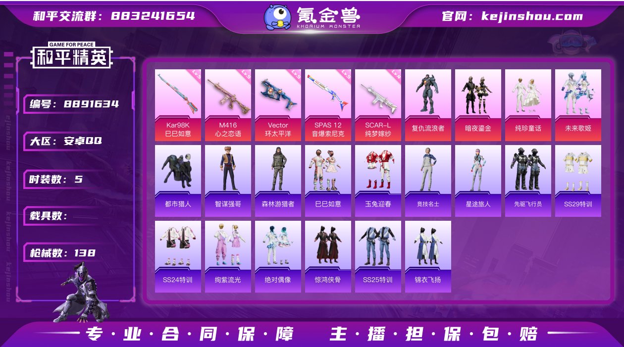 hs21748 安卓Q-39799热力值 3王牌印记 历史超级王牌8星 98套装 138枪皮 【1稀有】 都市猎人 【4粉装】 未来歌姬 纯珍童话 暗夜鎏金 复仇流浪者 【5特效枪】 SCAR-L-纯梦嫁纱 (4级) M416-心之恋语 (5级) Kar98K-巳巳如意 (5级) SPAS-12-音爆索尼克 (5级) Vector-环太平洋 (5级) 【2热门】 破蛋小黄鸡 极速红龙 营地ID:917453096