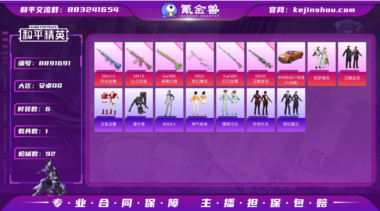hs21909 安卓Q-30518热力值 5王牌印记 历史超级王牌7星 55套装 92枪皮 【1载具】 宾利欧陆GT火焰橘 【2粉装】 玉鳞金羽 筑梦精灵 【6特效枪】 M416-心之恋语 (4级) Kar98K-巳巳如意 (2级) M200-玉鳞金羽 (1级) Mini14-荧光虫舞 (7级) Kar98K-绿意幻情 (4级) MG3-梦幻舞会 (4级) 【7热门】 醒狮腾龙 团圆交子 瑞龙福将 漫步者 梦之呓语 海洋之心 M762-瑞龙福将 【1头盔】 心之恋语头盔 【1背包】 夏日绵绵冰背包 营地ID:761263661