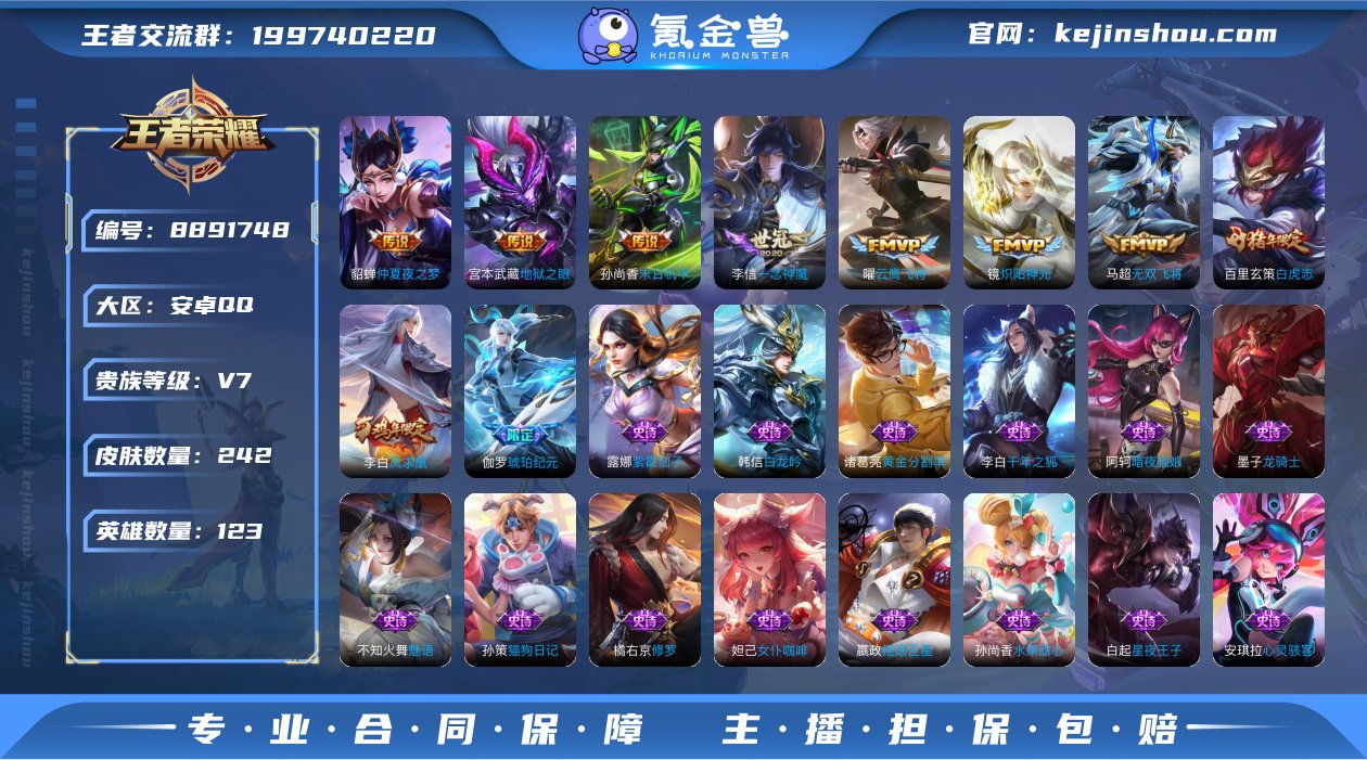 [9047106]V7 9传说 123英雄 242皮肤 可修改实名 传说皮:仲夏夜之梦(大飞蛾),地狱之眼,末日机甲-孙尚香(绿蚂蚱),一念神魔,云鹰飞将(小将军),炽阳神光,无双飞将 珍宝阁皮:妄想食味,优雅恋人,女武神,玩趣恶龙 限定皮:白虎志(电光耗子),凤求凰(白切鸡),遇见飞天,高山流水,五谷丰年,青龙志(铠年限),游园惊梦,梁祝,天狼狩猎者,李小龙,玄武志(苏烈年限),朱雀志(守约年限),孙行者,猪悟能,一生所爱,大圣娶亲,冰霜恋舞曲 史诗皮:星界战将,琥珀纪元伽罗,紫霞仙子,白龙吟,黄金分割率,千年之狐,暗夜猫娘,龙骑士(小龙虾),魅语,蒙恬荣光圣徽,猫狗日记-孙策,修罗,女仆咖啡,摇滚巨星,水果甜心,星夜王子,心灵骇客,功夫厨神,德古拉伯爵,暗隐猎兽者,幽灵船长,舞动绿茵,地狱岩魂,繁星吟游(呼啦呼啦),缤纷独角兽,乘风破浪,逐浪之夏,水晶猎龙者,箭羽风息,原初追逐者,圣诞狂欢,圣诞恋歌,鹰眼统帅,黎明之约,未来纪元-赵云