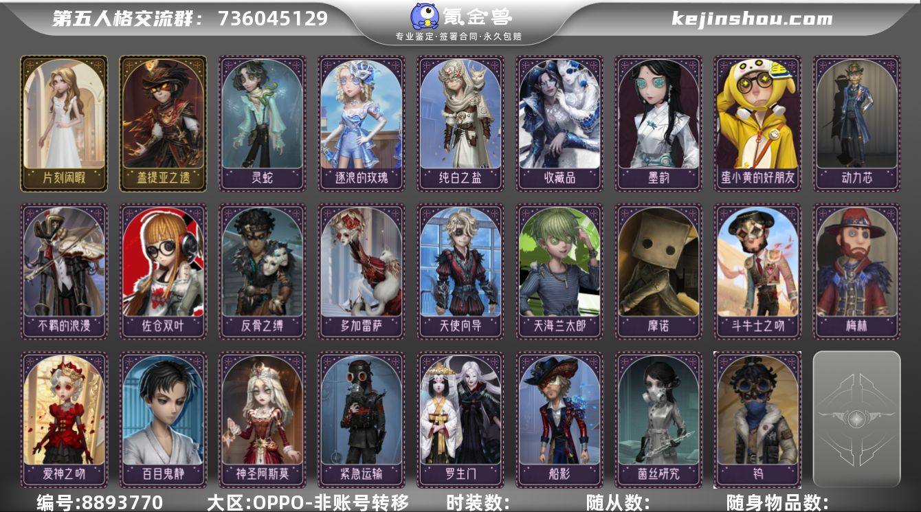 oppo渠道服 2金61紫 勘探员-盖提亚之遗,爱丽丝·德罗斯-片刻闲暇,红蝶-罗生门,机械师-佐仓双叶,击球手-反骨之缚,魔术师-梅林,空军-爱神之吻,“囚徒”-天海兰太郎,病患-天使向导,心理学家-神圣阿斯莫,使徒-多加雷萨,小提琴家-不羁的浪漫,爱哭鬼-摩诺,“慈善家”-斗牛士之吻,佣兵-百目鬼静,教授-紧急运输,牛仔-船影,古董商-菌丝研究,击球手-钨,先知-纯白之盐,调酒师-逐浪的玫瑰,哭泣小丑-灵蛇,魔术师-动力芯,幸运儿-蛋小黄的好朋友,古董商-墨韵,蜡像师-收藏品