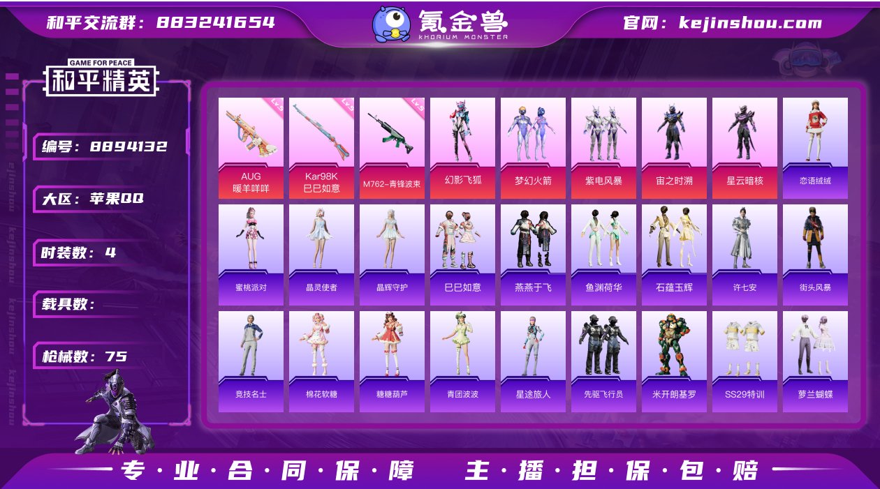 hs28435 苹果Q-23643热力值 3王牌印记 历史传奇王牌12星 52套装 75枪皮 【5粉装】 梦幻火箭 宙之时溯 星云暗核 幻影飞狐 紫电风暴 【4特效枪】 Kar98K-巳巳如意 (5级) M762-青锋波束 (5级) AUG-暖羊咩咩 (5级) GROZA-镜光银凌 (5级) 【2热门】 Mark.06 弄潮海豚 【1头盔】 梦幻火箭头盔 【1背包】 梦幻火箭背包 营地ID:978658600