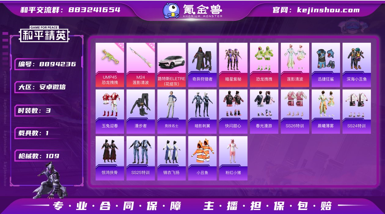 hs32037 安卓V-40239热力值 4王牌印记 历史超级王牌11星 102套装 109枪皮 【1载具】 路特斯EL灰色 【1稀有】 奇异狩猎者 【3粉装】 莲影清波 恐龙拽拽 暗星紫秘 【3特效枪】 M24-暗星紫秘 (3级) M24-莲影清波 (6级) UMP45-恐龙拽拽 (7级) 【11热门】 Mark.06 迅捷狂鲨 深海小丑鱼 团圆交子 瑞龙福将 粉红小猪 豚鼠丹丹 漫步者 破蛋小黄鸡 军刀雅典娜 M762-瑞龙福将 营地ID:798156587