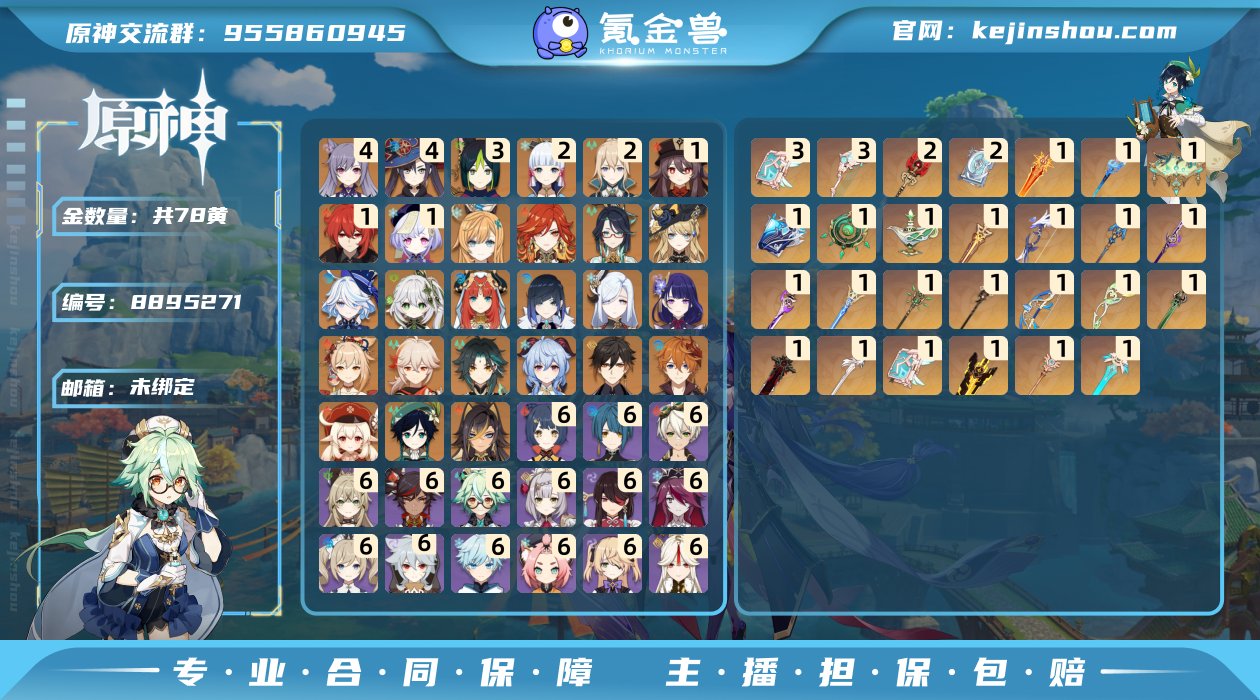 邮箱: 未绑定 总黄数: 78 冒险等级: 60 金色角色: 迪希雅,胡桃,雷电将军,钟离,夜兰,纳西妲,妮露,提纳里,温迪,枫原万叶,魈,甘雨,达达利亚,神里绫华,宵宫,可莉,七七,莫娜,迪卢克,琴,刻晴,申鹤,芙宁娜,娜维娅,闲云,玛薇卡,爱可菲 拥有武器: 狼的末路,猎人之径,千夜浮梦,圣显之钥,碧落之珑,贯虹之槊,终末嗟叹之诗,苍古自由之誓,薙草之稻光,护摩之杖,磐岩结绿,天空之脊,无工之剑,天空之翼,天空之刃,风鹰剑,和璞鸢,天空之卷,四风原典,雾切之回光,息灾,若水,万世流涌大典,静水流涌之辉,鹤鸣余音,焚曜千阳 亮点: 主站5级没实名,带明日方舟号。崩铁,绝区零开服号。还有一些其他游戏。买了死亡细胞和dlc。