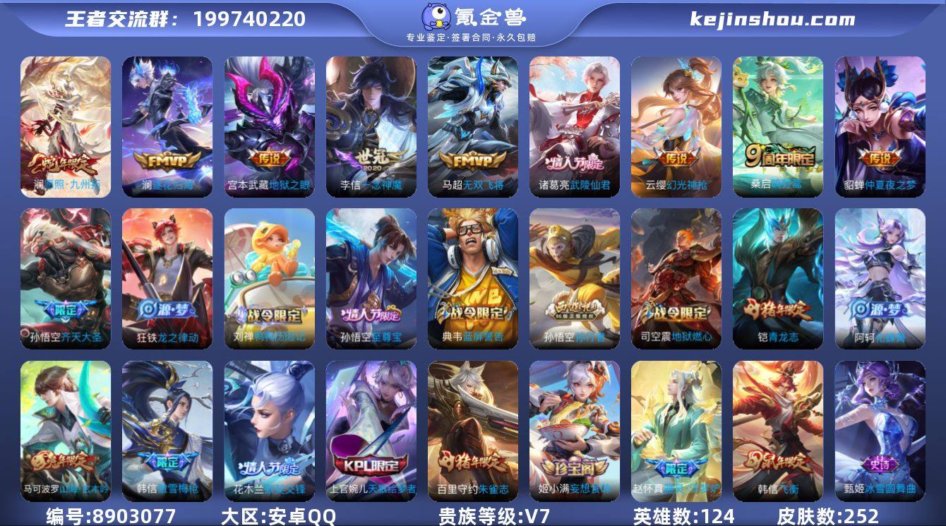 安卓QQ/ 252皮肤/ 124英雄 【10 传说皮肤】逐花归海 澜,无双飞将 马超,齐天大圣 孙悟空,仲夏夜之梦 貂蝉,地狱之眼 宫本武藏,武陵仙君 诸葛亮,一念神魔 李信,愿照·九州拓 澜,幻光