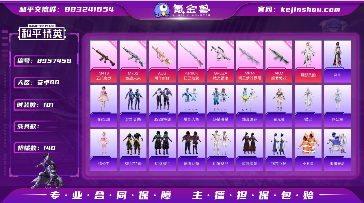 【商品标题】:安卓【精品号/一套绝世印记 哥特 满级五爪金龙-1粉装-7特效枪】 手Q-45518热力值-7印记-101套装-140枪皮 【特效枪等级】:AKM-绿萝繁花(五级),M416-五爪金龙(七级),GROZA-镜光银凌(五级),AUG-暖羊咩咩(五级),M762-激战未来(六级),Kar98K-巳巳如意(五级),Mk14-精灵梦叶罗丽(五级) 【优质套装】:角色-月影灵韵 【稀有套装】:套装-巳巳如意,套装-糖糖葫芦,套装-青团波波,套装-棉花软糖,角色-临安公主,套装-燕燕于飞,套装-鱼渊荷华,角色-风玲 【优质武器皮肤】:AKM-绿萝繁花,M416-五爪金龙,AUG-暖羊咩咩,M762-激战未来,Kar98K-巳巳如意,Mk14-精灵梦叶罗丽,DBS-创世·救赎 【稀有武器皮肤】:AKM-灼热熔岩,AKM-破晓战魂,AKM-萌趣颜团子,AKM-虎虎生威,AKM-龙的传人,M16A4-幻世战舞者,M16A4-甜心亚梦,SCAR-L-炫彩节奏,SCAR-L-玉兔迎春,SCAR-L-红色方程式,M416-红色方程式,M416-蓝色火焰,GROZA-彩虹符号,AUG-耀粉歌者,QBZ-彩虹符号,QBZ-飞驰魅影,Mk47-炫光之旅,G36C-时空追击者,AC-VAL-天降萌叽,AC-VAL-甜心亚梦,蜜獾-天降萌叽,蜜獾-娇憨猪猪,UZI-啾咪啾咪,UZI-天降萌叽,UZI-娇憨猪猪,UZI-炫彩节奏,UZI-红色方程式,UZI-月影灵韵,UMP45-时空追击者,UMP45-蓝色火焰,UMP45-绒宝小鹅,Vector-焰鹰斗篷,汤姆逊-天降萌叽,汤姆逊-奇异狩猎者,AKS-74U-鬼刀,P90-飞驰魅影,P90-巳巳如意,Kar98K-飞驰魅影,M24-炫彩节奏,M24-奇异狩猎者,AWM-焰鹰斗篷,AWM-飒粉甜心,SKS-时空追击者,SKS-炫彩节奏,SKS-糯团青竹,SKS-青瓷战姬,Mini14-旋转彩虹,SLR-娇憨猪猪,SLR-彩虹符号,M417-惊鸿侠骨,M200-惊鸿侠骨,S686-奇异狩猎者,S686-红色方程式,S686-巳巳如意,S1897-炫彩节奏,S1897-飞驰魅影,S12K-玩趣呆呆,S12K-破晓战魂,S12K-夜灯,S12K-娇憨猪猪,S12K-幻世战舞者,DBS-焰鹰斗篷,DBS-时空追击者,DBS-甜心亚梦,M249-