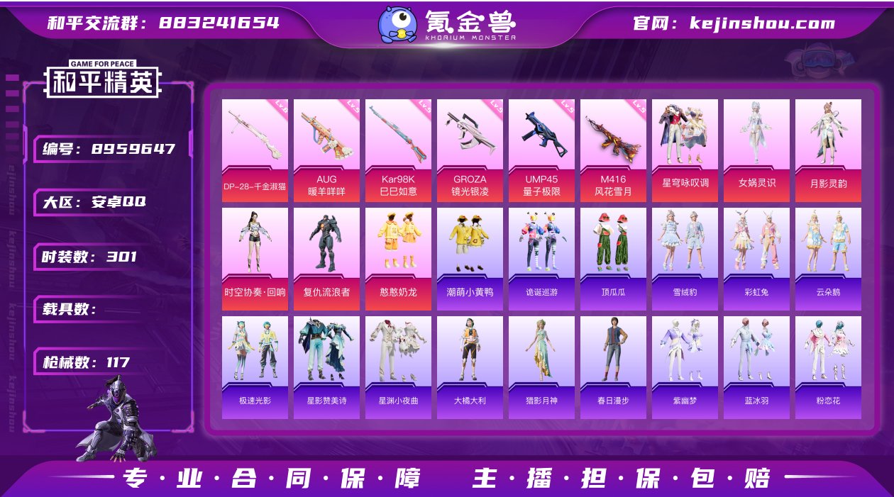 【地铁4级天赋】安卓Q-39058热力值 7王牌印记 历史卓越王牌12星 73套装 117枪皮 【1稀有】 浪漫天命 【6粉装】 女娲灵识 时空协奏·回响 憨憨奶龙 月影灵韵 星穹咏叹调 复仇流浪者 【6特效枪】 Kar98K-巳巳如意 (5级) DP-28-千金淑猫 (6级) AUG-暖羊咩咩 (5级) UMP45-量子极限 (5级) GROZA-镜光银凌 (5级) M416-风花雪月 (5级) 【3热门】 8号机(粉螳螂) 潮萌小黄鸭 暗影哥特 营地ID:950434102