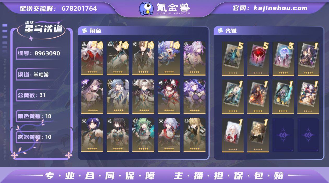 总黄数: 31 3命金色角色: 3命克拉拉 1命金色角色: 1命白露,1命瓦尔特,1命丹恒•饮月 0命金色角色: 0命姬子,0命布洛妮娅,0命杰帕德,0命罗刹,0命托帕&账账,0命藿藿,0命阮•梅,0命真理医生,0命黑天鹅,0命花火,0命流萤,0命星期日,0命大黑塔,0命遐蝶 精5武器: 精5孤独的疗愈,精5记一位星神的陨落 精3武器: 精3记忆永不落幕 精1武器: 精1如泥酣眠,精1无可取代的东西,精1烦恼着,幸福着,精1惊魂夜,精1游戏尘寰,精1梦应归于何处,精1向着不可追问处