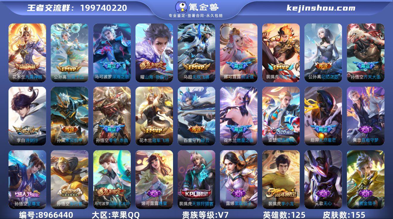 实名: 可修改 性别: 男号 贵族等级: V7 英雄数: 125 皮肤数: 155 荣耀水晶: 九霄神辉 传说皮: 冠军飞将,零号·赤焰,末日机甲-孙策,无双飞将,碎云,山海·苍雷引,燃星之曲,记忆之芯,追逃游戏(亚瑟),祥瑞亨通,云诺千山 限定皮: 李小龙,天狼狩猎者,至尊宝,高山流水,孙行者,无尽星芒,深海之息,前尘镜,匿光启智者,诗剑行,山海·玄木吟,齐天大圣