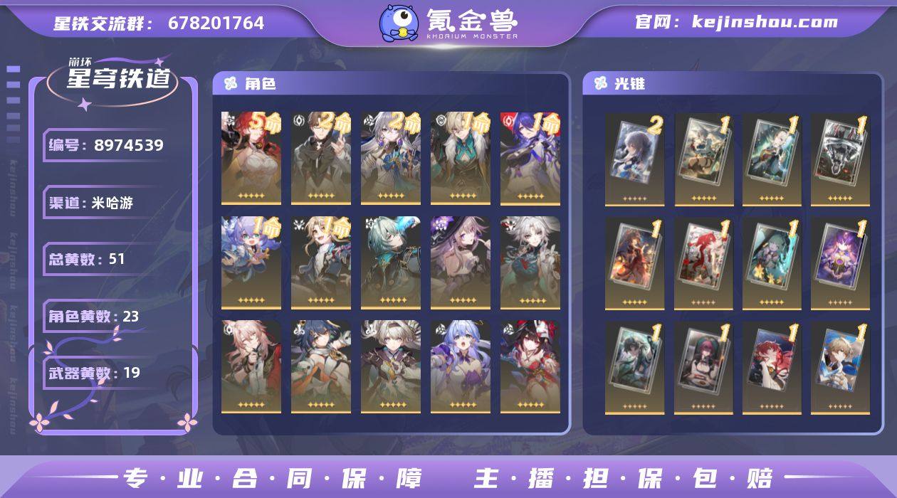 总黄数: 51 5命金色角色: 5命姬子 2命金色角色: 2命瓦尔特,2命布洛妮娅 1命金色角色: 1命彦卿,1命白露,1命黄泉,1命砂金 0命金色角色: 0命克拉拉,0命卡芙卡,0命丹恒•饮月,0命符玄,0命藿藿,0命银枝,0命阮•梅,0命真理医生,0命花火,0命知更鸟,0命流萤,0命飞霄,0命椒丘,0命云璃,0命大黑塔,0命那刻夏 精2武器: 精2但战斗还未结束 精1武器: 精1时节不居,精1制胜的瞬间,精1无可取代的东西,精1银河铁道之夜,精1只需等待,精1比阳光更明亮的,精1她已闭上双眼,精1惊魂夜,精1记忆的质料,精1孤独的疗愈,精1记一位星神的陨落,精1星海巡航,精1片刻,留在眼底,精1游戏尘寰,精1行于流逝的岸,精1梦应归于何处,精1不息的演算,精1我将,巡征追猎