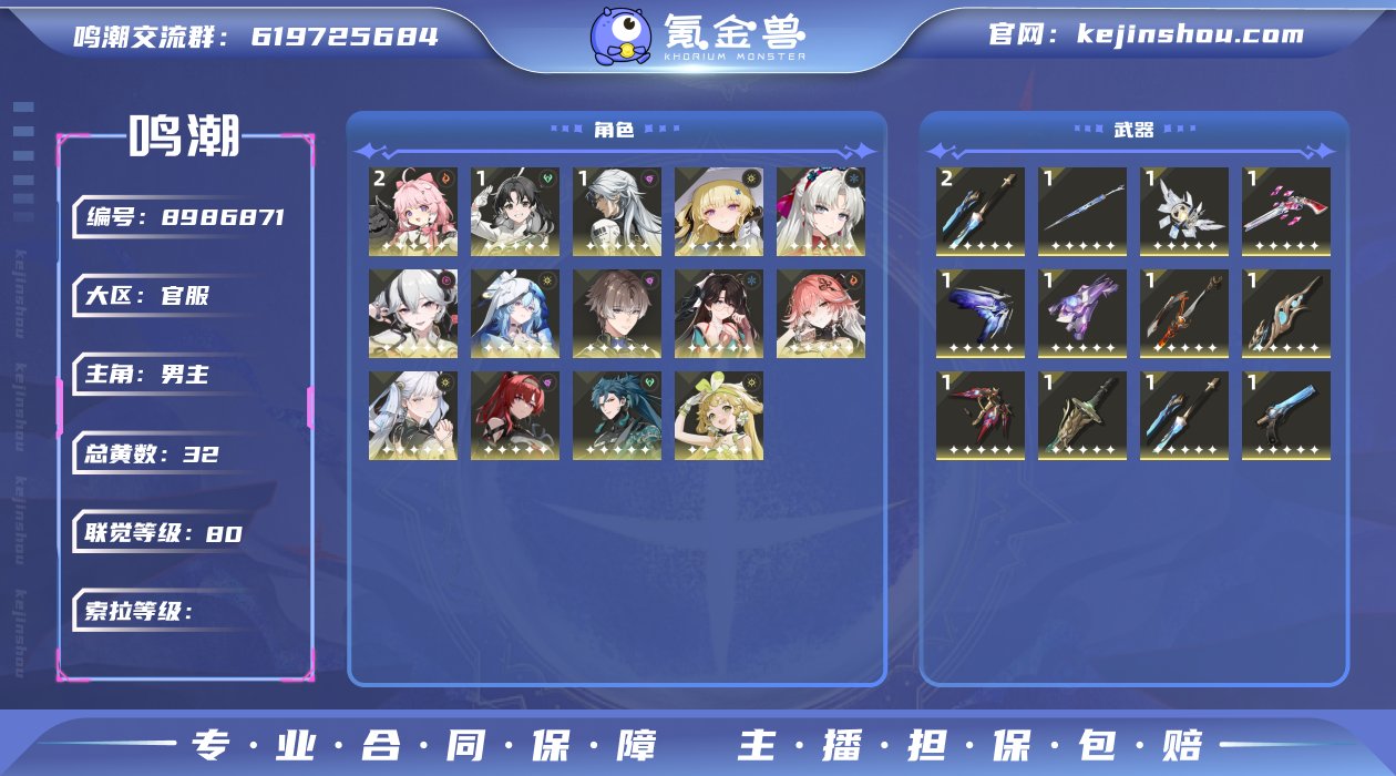 80级/32黄/男主/14个五星角色/13个五星武器未绑定,菲比,珂莱塔,椿,守岸人,相里要,折枝,长离,今汐,吟霖,忌炎,维里奈,鉴心,卡卡罗,安可,不屈命定之冠,和光回唱,死与舞,星序协响,诸方玄枢,赫奕流明,时和岁稔,掣傀之手,苍鳞千嶂,千古洑流,停驻之烟,2命安可,1命鉴心,1命卡卡罗,0命菲比,0命珂莱塔,0命椿,0命守岸人,0命相里要,0命折枝,0命长离,0命今汐,0命吟霖,0命忌炎,0命维里奈,精2千古洑流,精1不屈命定之冠,精1和光回唱,精1死与舞,精1星序协响,精1诸方玄枢,精1赫奕流明,精1时和岁稔,精1掣傀之手,精1苍鳞千嶂,精1千古洑流,精1停驻之烟