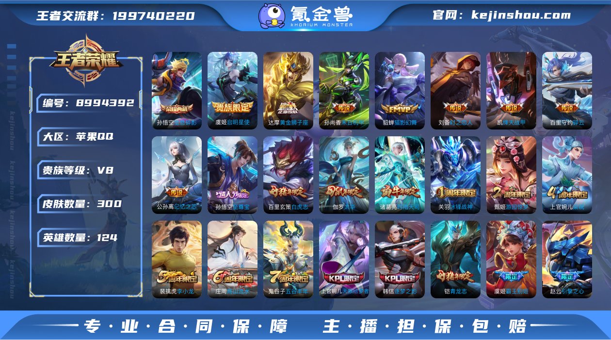实名: 可修改 贵族等级: V8 英雄数: 124 皮肤数: 300 荣耀水晶: 全息碎影