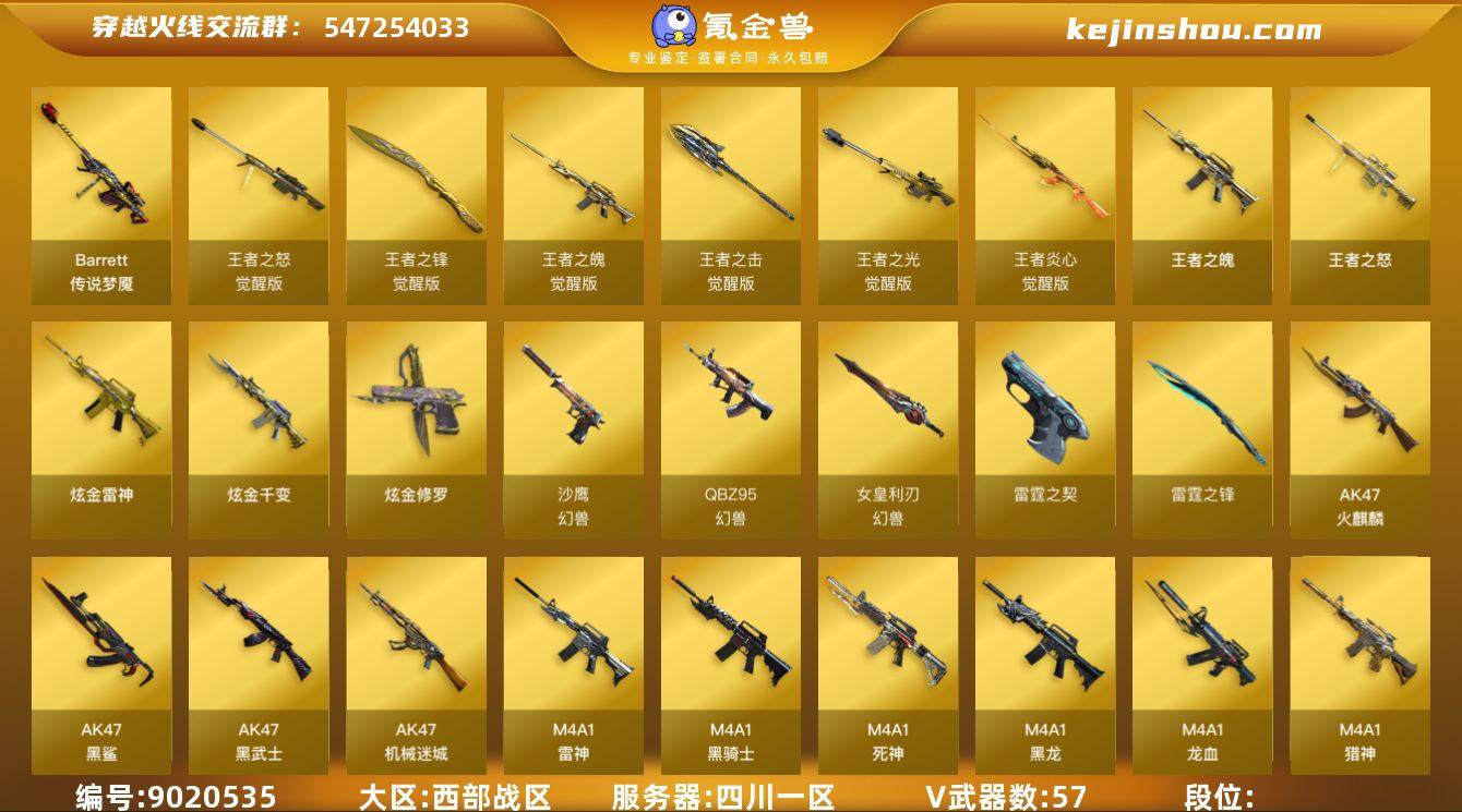 实名: 可修改 排位资格: 有 V武器: AK47-火麒麟,AK47-黑鲨,AK47-黑武士,AK47-机械迷城,M4A1-雷神,M4A1-黑骑士,M4A1-死神,M4A1-黑龙,M4A1-龙血,M4A1-猎神,M4A1-玫瑰精灵,Barrett-毁灭,Barrett-极光,Barrett-朱雀,AWM-天龙,AWM-裁决,M200-幻神,AA-12-雷霆,AK12-天启,HK417-朱雀,QBZ03-金色蔷薇,9A91-烈火,RPK-盘龙,汤姆逊-烈龙,加特林-炼狱,沙鹰-修罗,沙鹰-天神,屠龙,龙啸,麒麟刺,擎天,传说梦魇,M200-竞技荣光,柯尔特-竞技荣光,USP-雷暴,擎天-竞技荣光,AK47-B-战士,AK47-B-战神,AK-47-猩红传说,裁决,烈龙,盘龙,修罗,雷霆之锋,雷霆之契,女皇利刃-幻兽,QBZ95-幻兽,沙鹰-幻兽 王者武器: 王者之魄,王者之怒,王者炎心-觉醒版,王者之光-觉醒版,王者之击-觉醒版,王者之魄-觉醒版,王者之锋-觉醒版,王者之怒-觉醒版 炫金武器: 炫金雷神,炫金千变,炫金修罗 热门武器: COP-旗袍,M37-葵,巴雷特-零-水下丽影,天龙-曼陀罗 狙击枪稀有皮肤: 毁灭-荣耀之怒,毁灭耀金皮肤,毁灭-星空,毁灭-青帝,毁灭-荣耀之怒-网吧特权 英雄角色: 炫,魅影,电竞教官-云悠悠,王者-沙漠玫瑰,兰-海滩派对,狐影 音效道具: M4A1-雷神音效卡,Barrett-毁灭音效卡