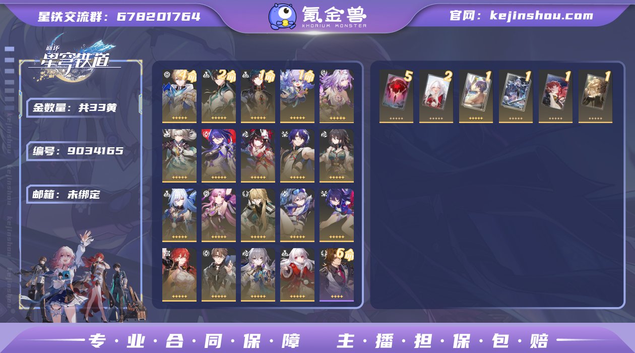 邮箱: 未绑定 开拓者性别: 女 总黄数: 33 开拓等级: 70 金色角色: 罗刹,银狼,刃,希儿,白露,姬子,瓦尔特,布洛妮娅,克拉拉,杰帕德,丹恒•饮月,符玄,镜流,阮•梅,真理医生,花火,黄泉,流萤,遐蝶 拥有武器: 如泥酣眠,银河铁道之夜,无可取代的东西,此身为剑,纯粹思维的洗礼,记一位星神的陨落